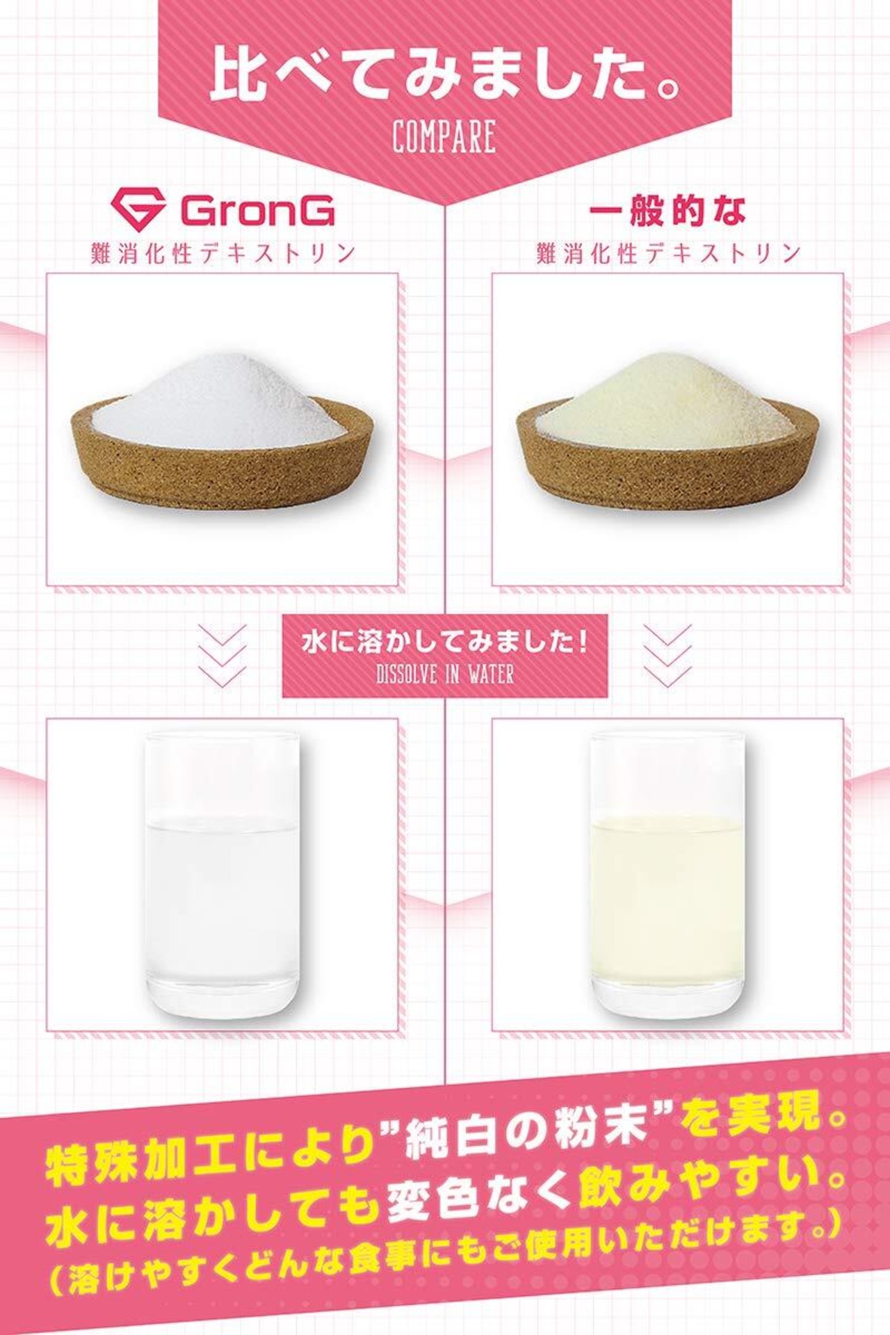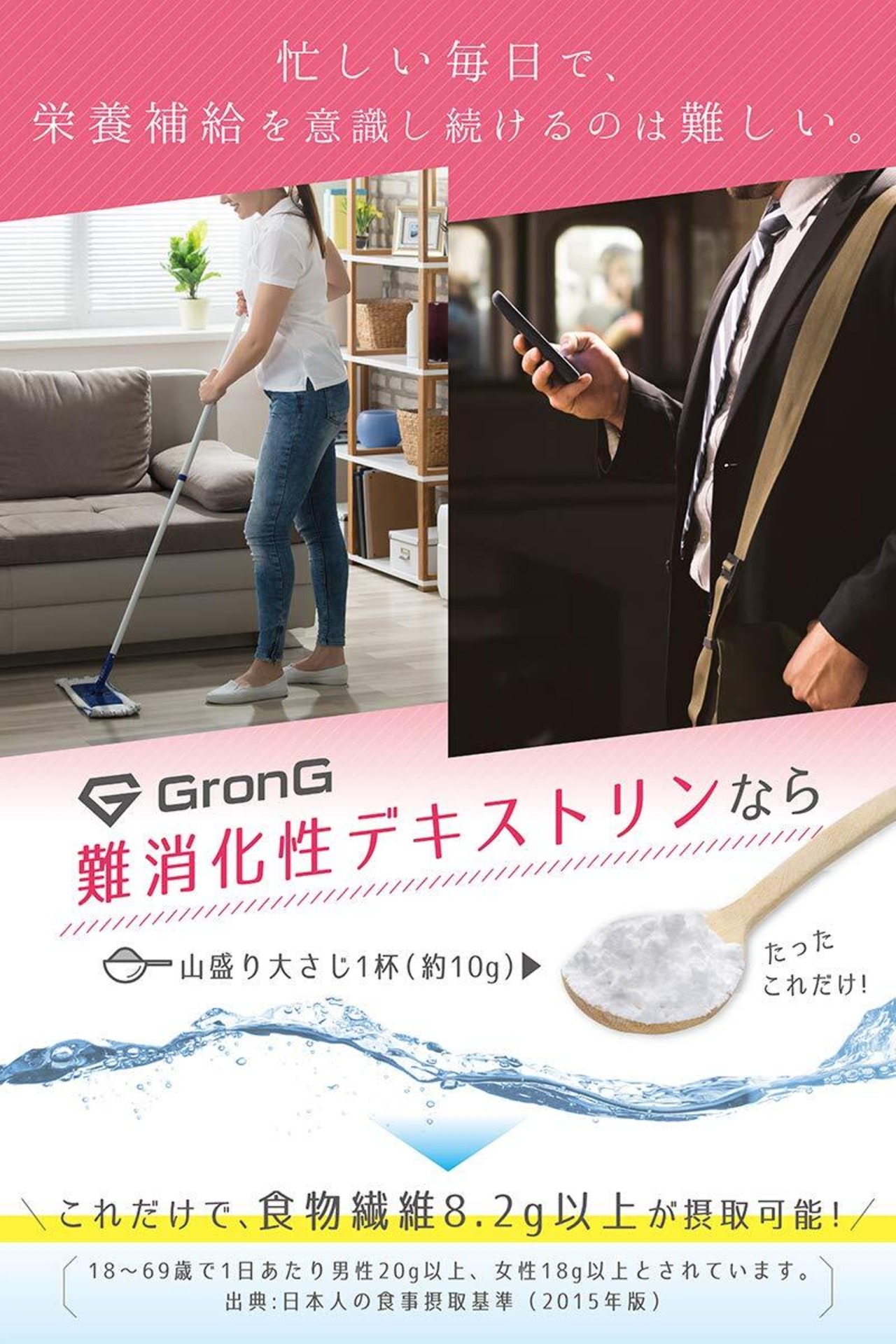 【GronG 難消化性デキストリン】●「水溶性食物繊維」は82~88% ●山盛り大さじ1杯(約10g)で食物繊維8.2g以上の摂取が可能。忙しい毎日で栄養補給を意識するのが難しい方にオススメです。