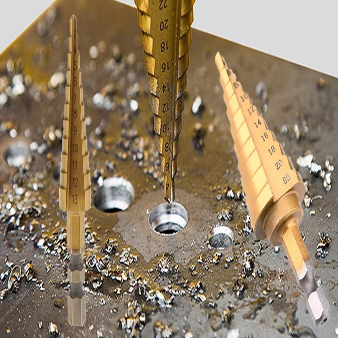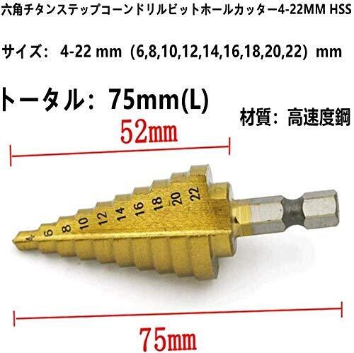 ステップドリル 2/3本セット 4-22mm 3-13mm/4-20mm 4-12mm 3-12mm チタンコーティング スパイラル HSS鋼4241板金用六角チタンコーンドリルビットホールカッター 六角轴スパイラル (2本セット4-22mm 3-13mm)