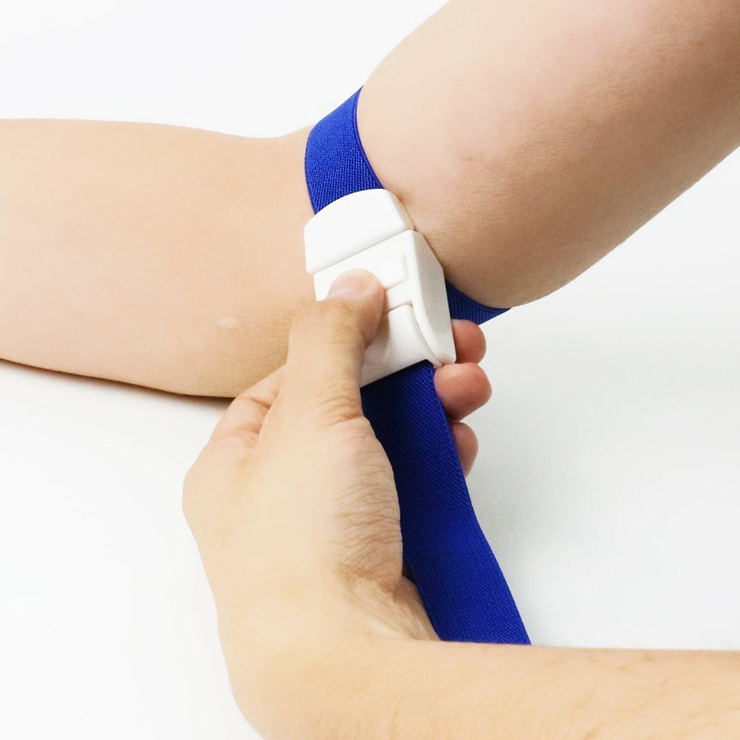 腕に巻い巻いた後、カチッと駆血帯を取り付け後は締め付けのみの簡単使用。※締め付けた後は逆止弁で軽固定されバンドの伸縮性で、丁度良い締め付け使用感となります。
