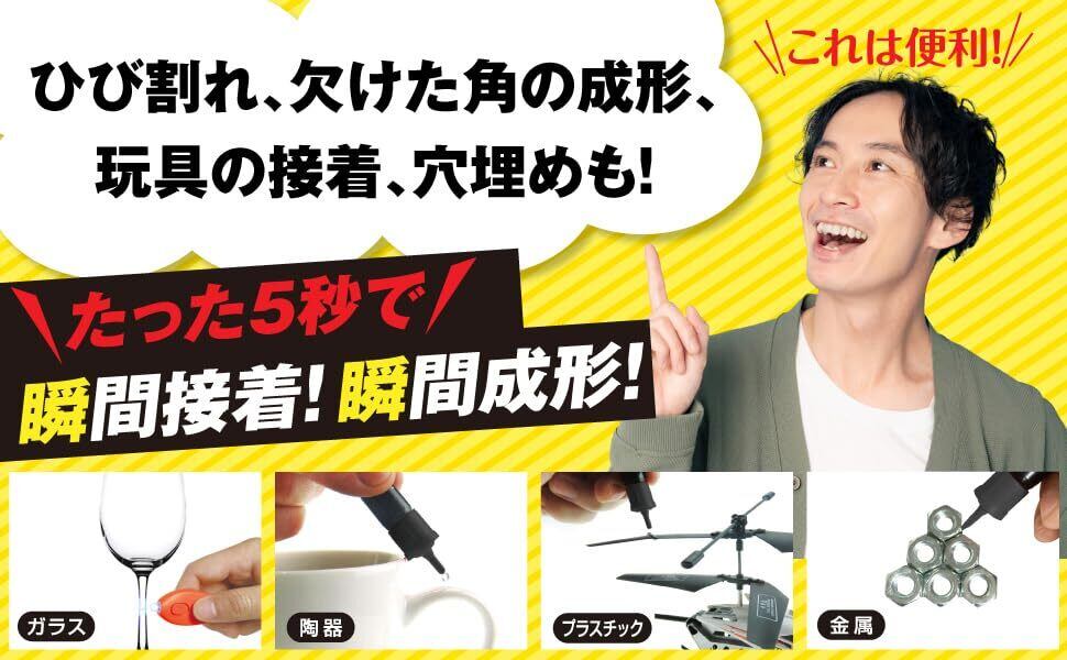 【ライトをあてると5秒で固まる】ガラス、陶器、プラスチック、金属などあらゆる素材に接合が可能。