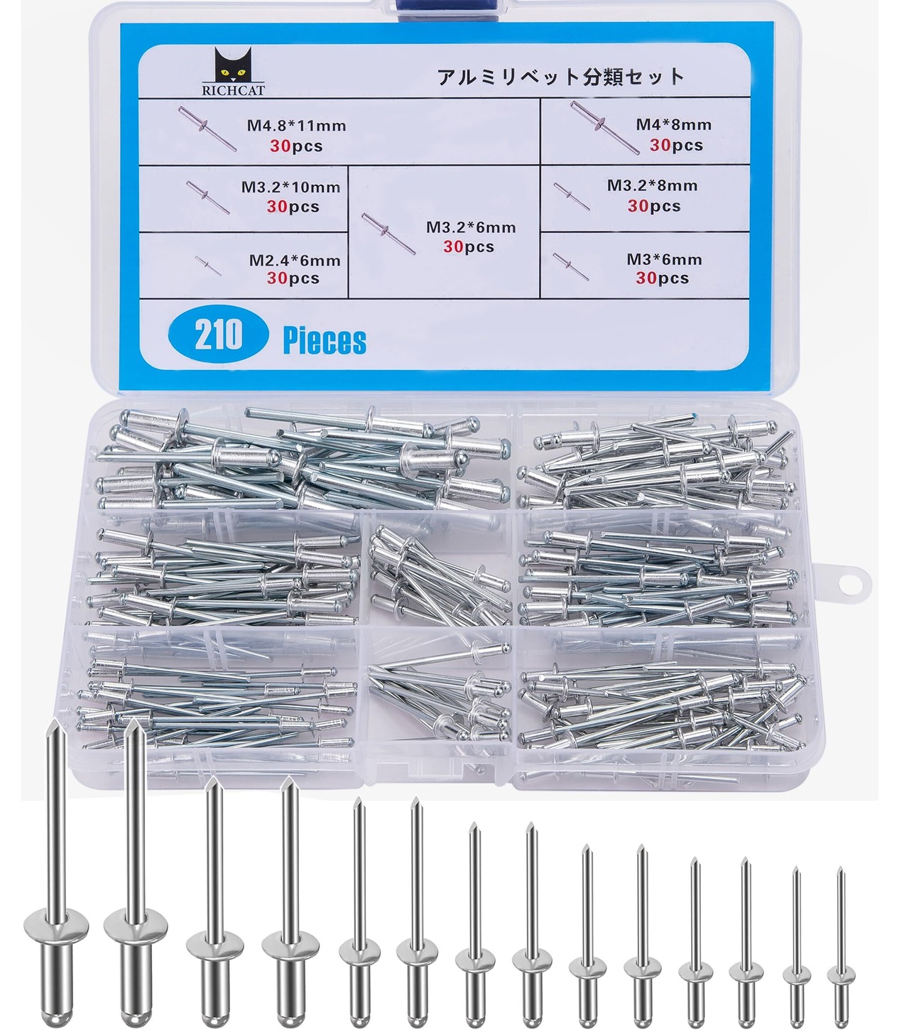 【210個リベット セット 仕様】M2.4*6mm(30個)、 M3*6mm(30個)、M3.2*6mm(30個)、M3.2*8mm(30個)、M3.2*10mm(30個)、M4*8mm(30個)、M4.8*11mm(30個)合計210個セットです。さまざまな仕様がさまざまなニーズに対応します。ボックス付き収納や持ち運びが簡単です。1年間の、無料の返品および交換。