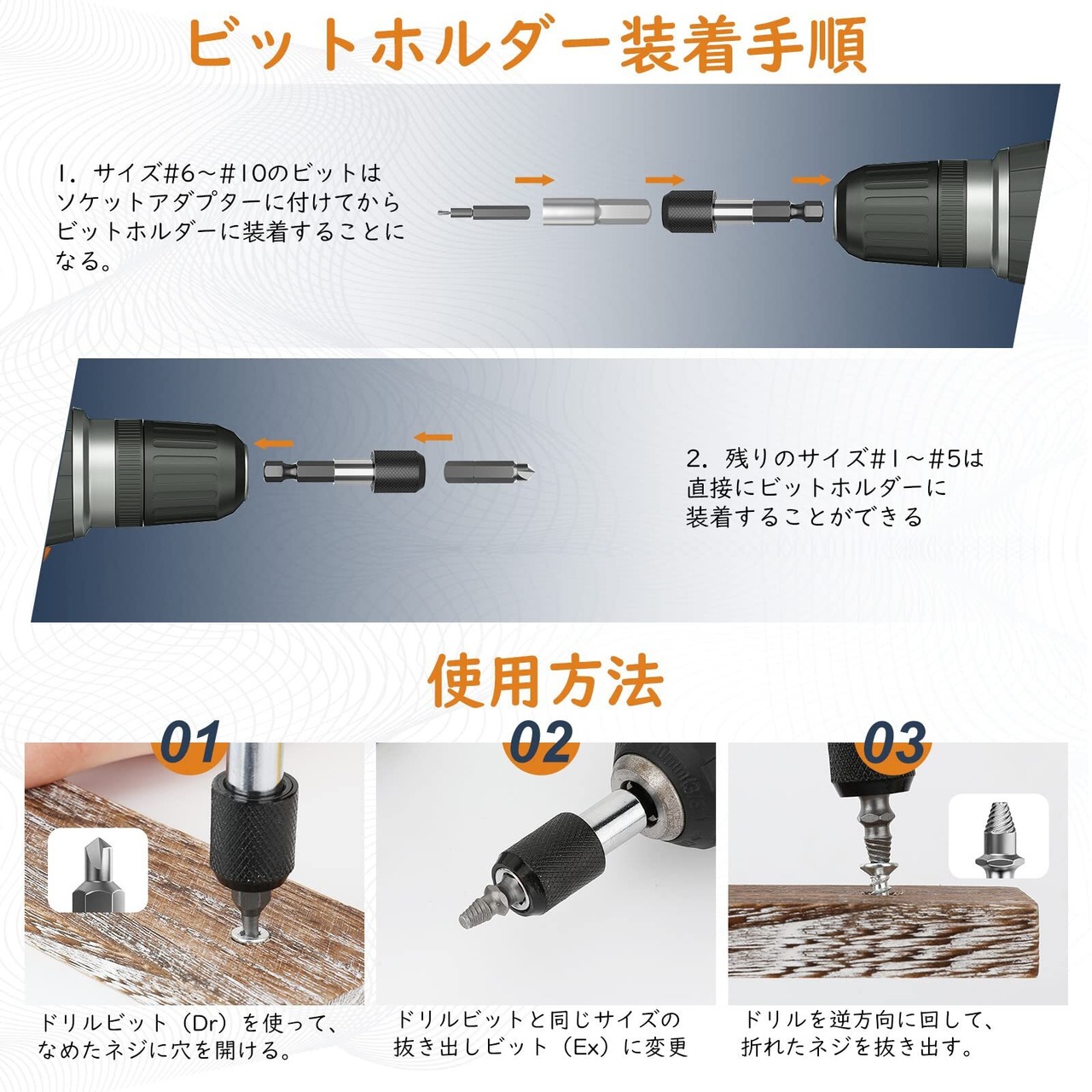 「 簡単3ステップでネジをスムーズに除去」①ドリルビットでネジに穴を開け、②同じサイズのエキストラクターに交換、③ドリルを逆回転させてネジを抜き出すだけ。ハンマーや接着剤を使う手間なく、きれいに外せます。(※サイズ#6~#10はソケットアダプターが必要)