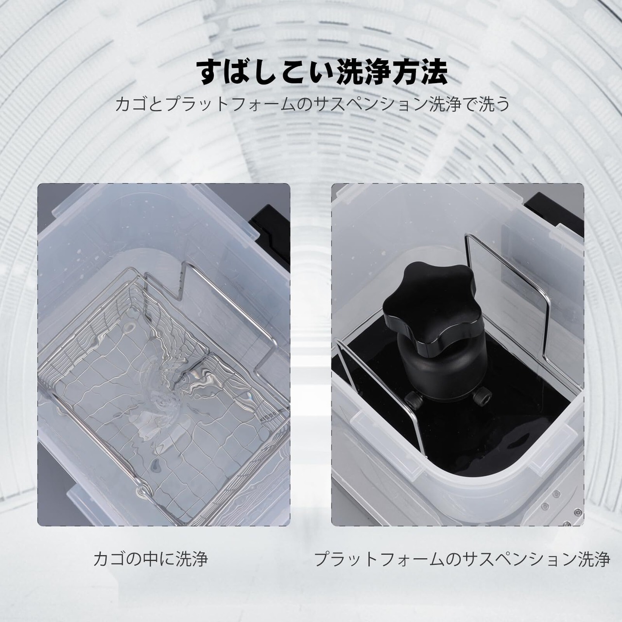 【特記事項】洗浄機能は、水洗い可能な樹脂で印刷された3Dモデルにはあまり適しておらず、流水で洗浄する方がおすすめします。モデルだけで洗浄する場合、高さは160mm以下のモデルをクリーニングおよび硬化することが対応できます。