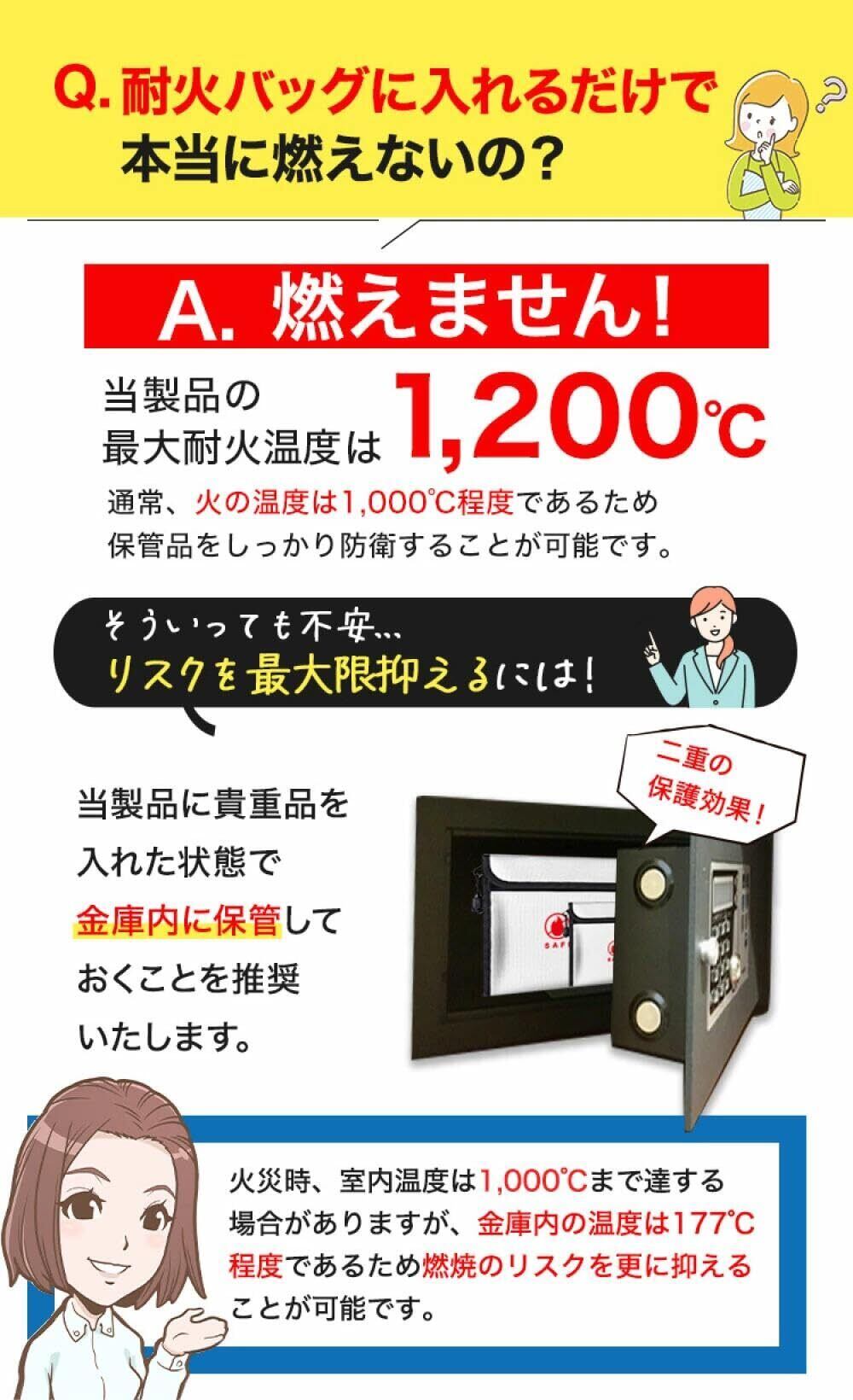 【 最大 耐火温度 1200℃ でしっかり防御 】通常火の温度は1,000℃程度であるため、 保管品をしっかりと防御できます。金庫内に保管すれば、二重の保護効果でリスクをさらに軽減することが可能です。
