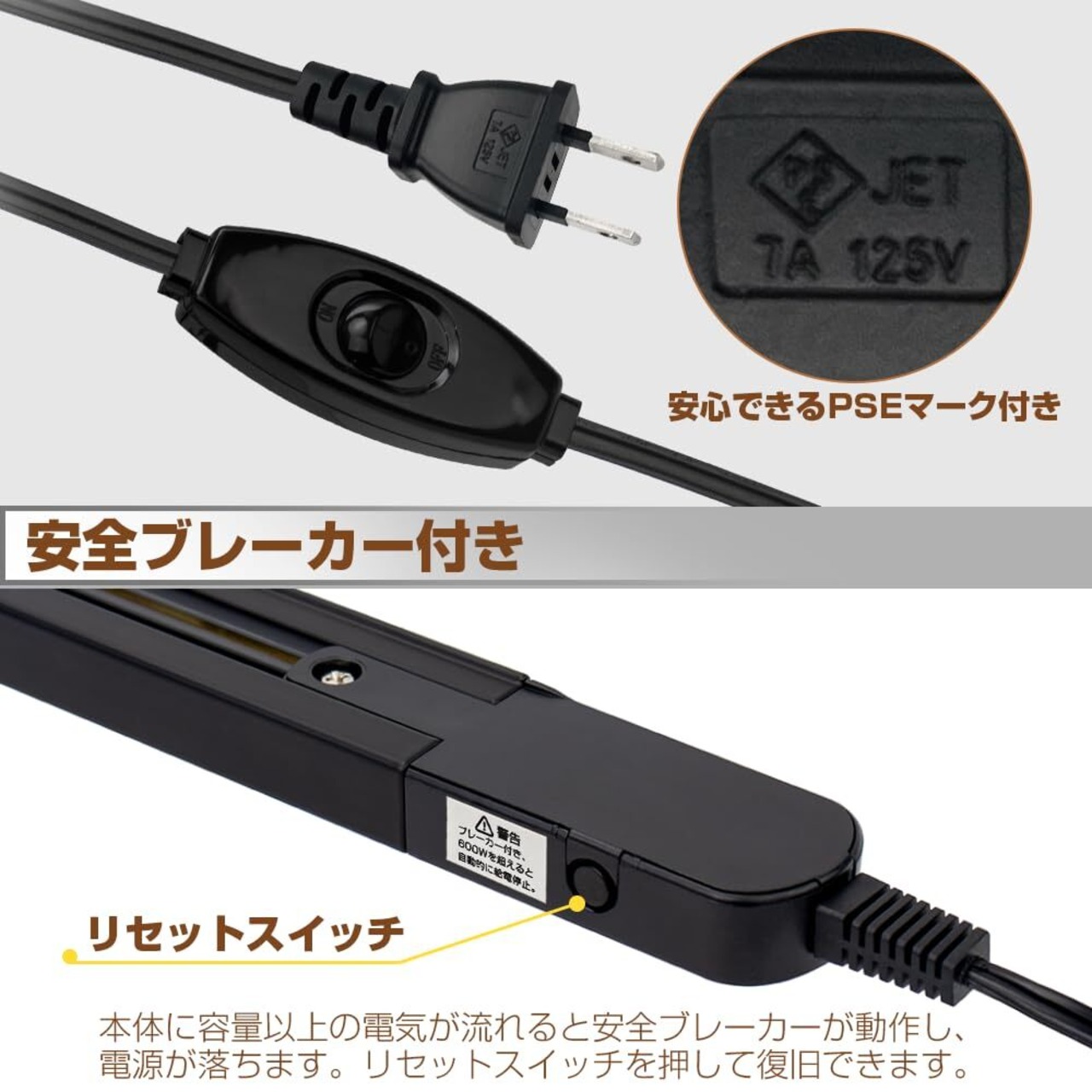 【電源スイッチ・安全ブレーカー付き】電源コード途中に中間スイッチが付いているため、ACプラグを抜き差しせずにON/OFFを切り替えできるので、点灯・消灯操作が便利になりおすすめのライティングダクトレールです。ブレーカー付きですので、定格容量(600W)を超えると自動的に給電がとまります。※ブレーカーを復帰させる場合は、602W以下になるように器具を取り除き、レール側面のリセットボタンを押してください。