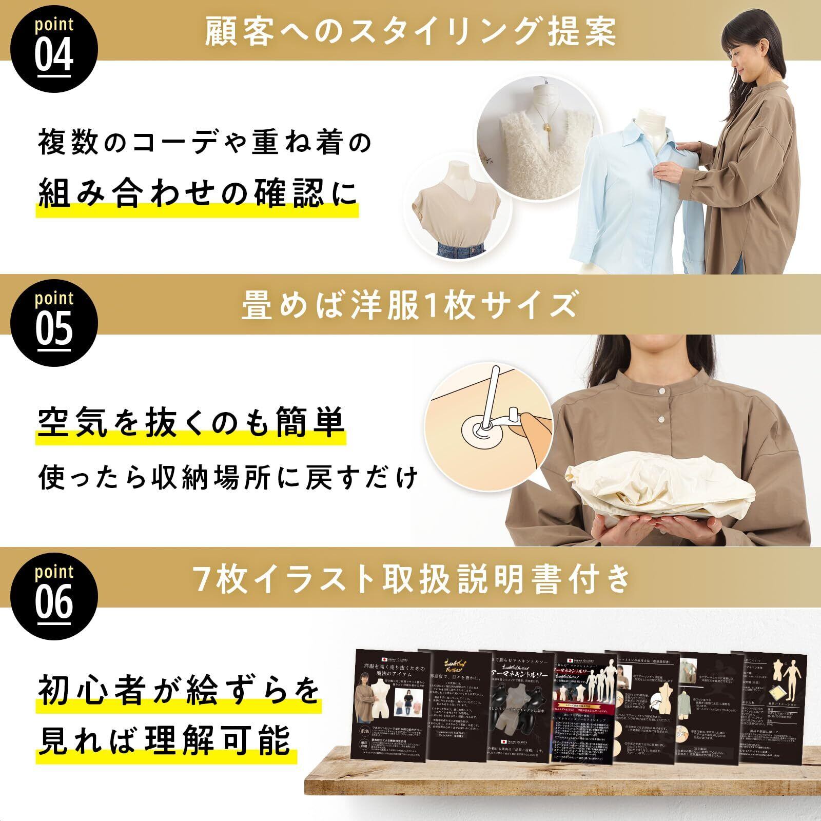 【機能】使用方法は簡単。空気口から空気入れて膨らませるだけ。モデル体型の空気式マネキン(トルソー)が完成です。エアーマネキンのため、使用後はボディの空気を抜けば収納スペース不要。持ち運びにも便利です。