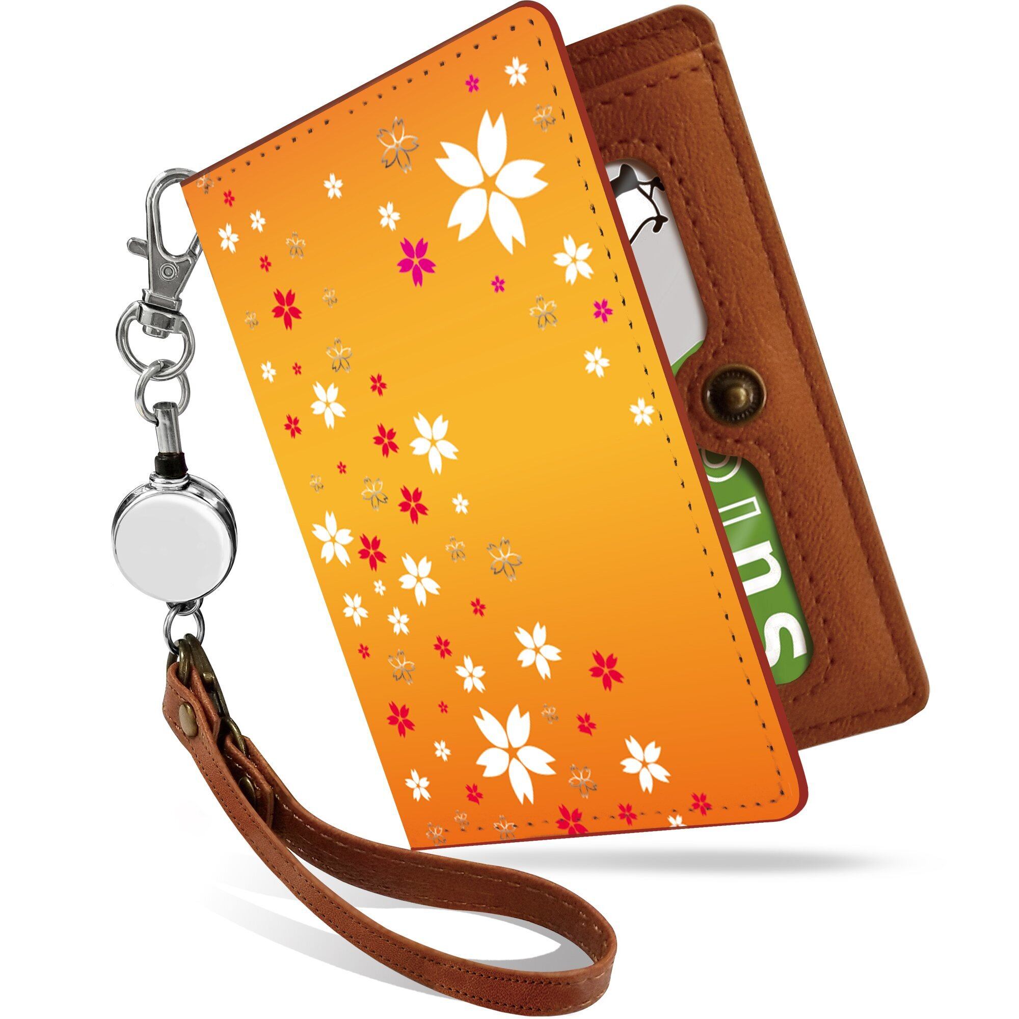 Pretimo 定期入れ icカードケース 二つ折り メンズ レディース 通勤 通学 花 花柄 フラワー 和柄 日本 中がみえない 植物 植物柄 ボタニカル リール付きパスケース オレンジ 桜 秋空/ps