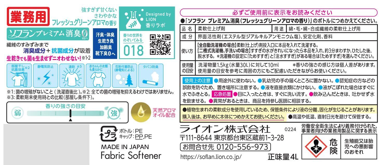 【2022最新】ソフラン プレミアム消臭 【業務用 大容量】 フレッシュグリーンアロマの香り 4L 詰め替え 液体 柔軟剤 部屋干し 抗菌 消臭