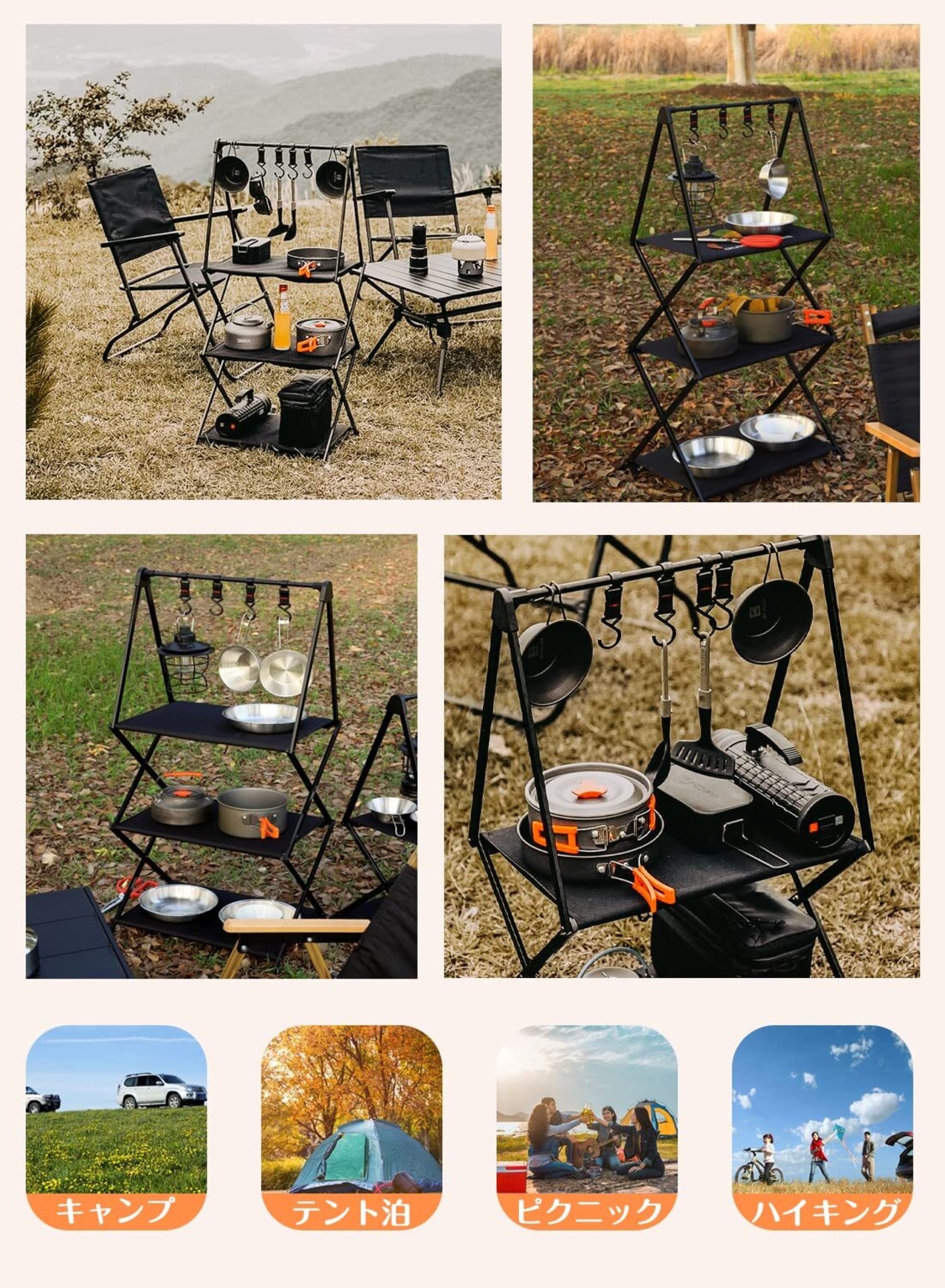 【収納性が向上される】キャンプラックは3段タイプで、限りある空間を有効活用!様々なアイテムを仕分けて整理整頓できます。3段の棚板に加え、上部のポール部分も収納スペースとして活用可能です。また便利なスライド式ハンガーフックが4つ付属しており、洗った食器やマグカップ等、使わないものを掛けて収納できます。