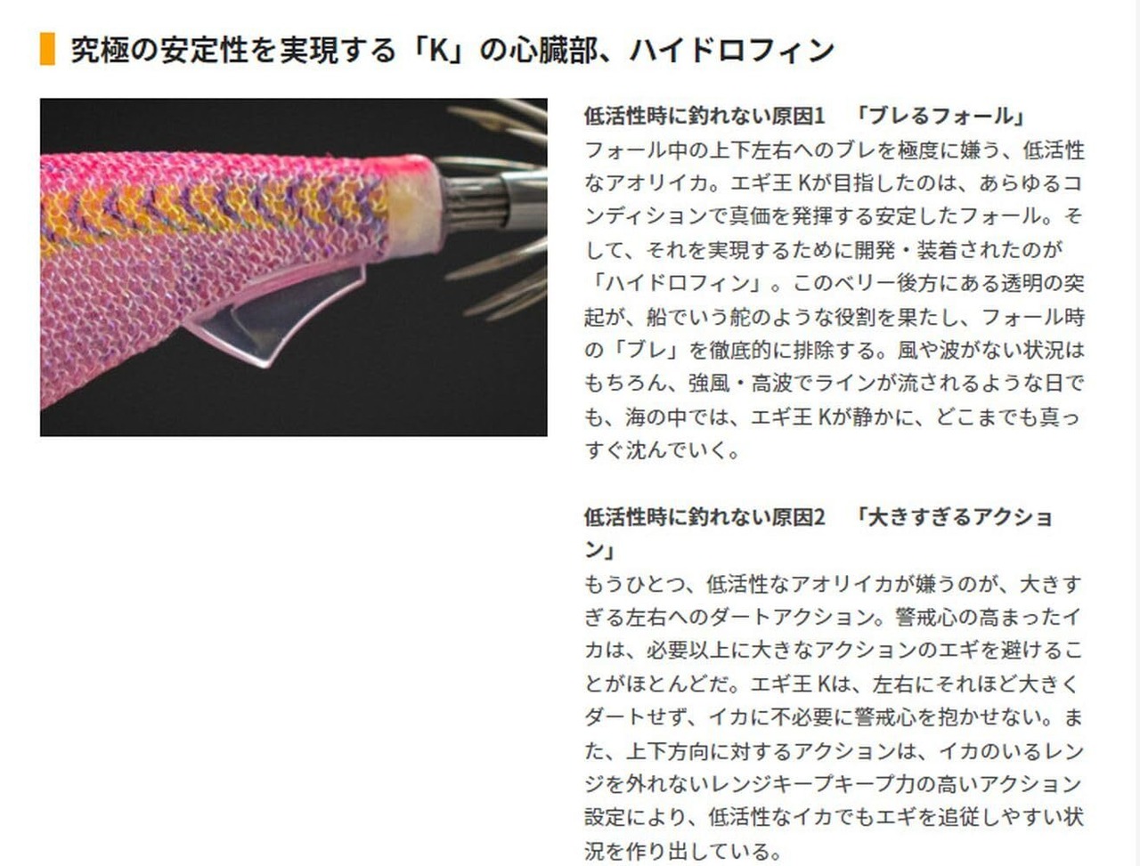 カラー:ケイムラボディとクリアブルーのナチュラル感が活性の低いイカに効果を発揮するカラー。日中や澄み潮時に使いたい1色。
