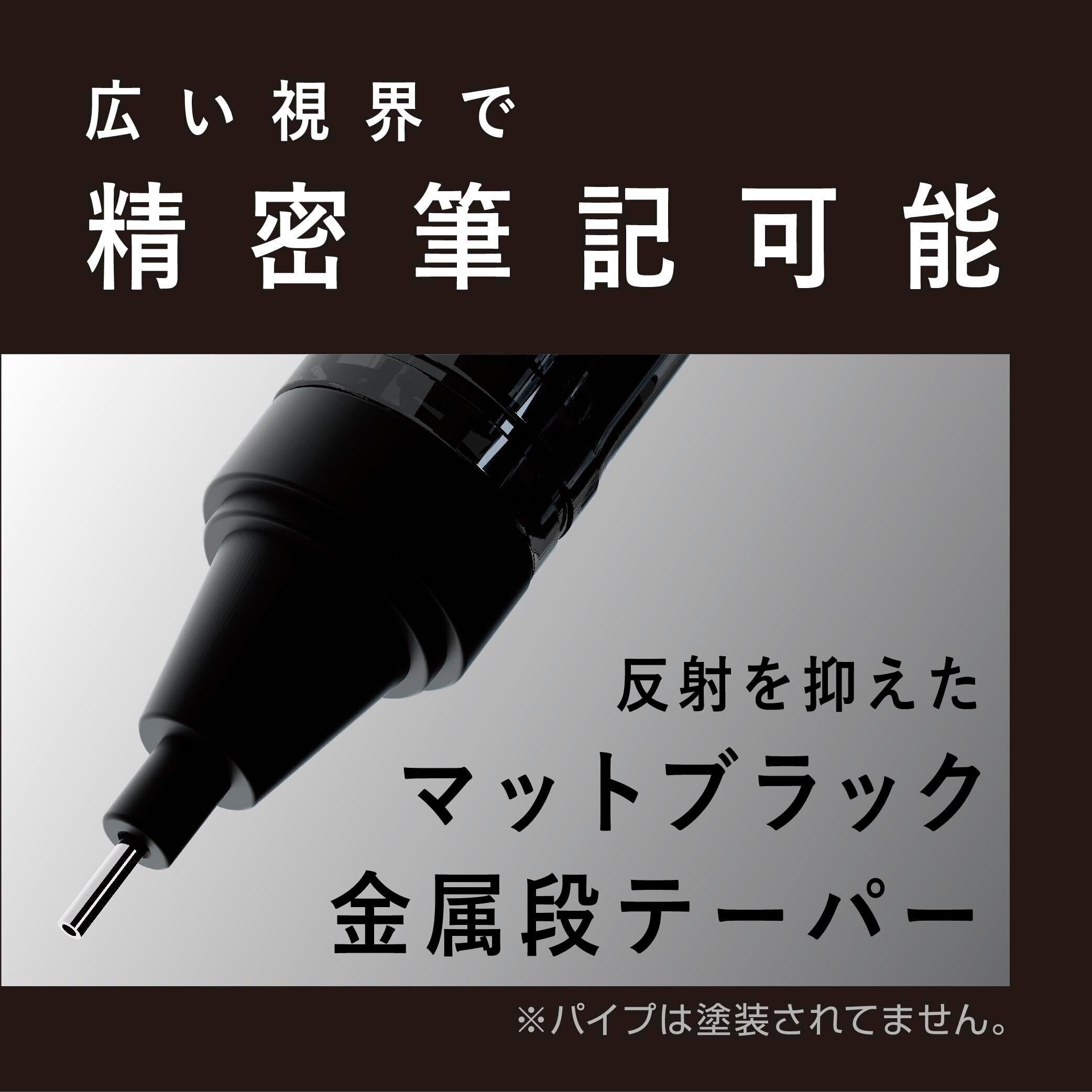 【マットブラックのペン先】製図用シャーペンに使用される固定パイプ式。手元がよく見えることに加え、ペン先まで極めた黒塗装仕様により反射が抑えられ、より書きやすくなりました。