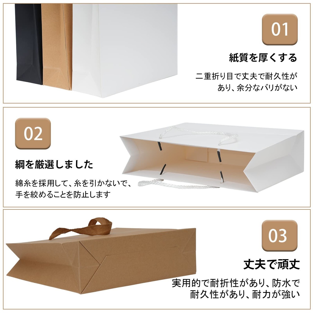 【高品質素材】: 高品質エコクラフト紙でよく加工しており、耐久性がいいです。 頑丈な織りハンドルは、通常のハンドルよりも強い高級感を与え、高負荷時でもより快適なフィーリングを提供します、繰り返しご利用頂けます。