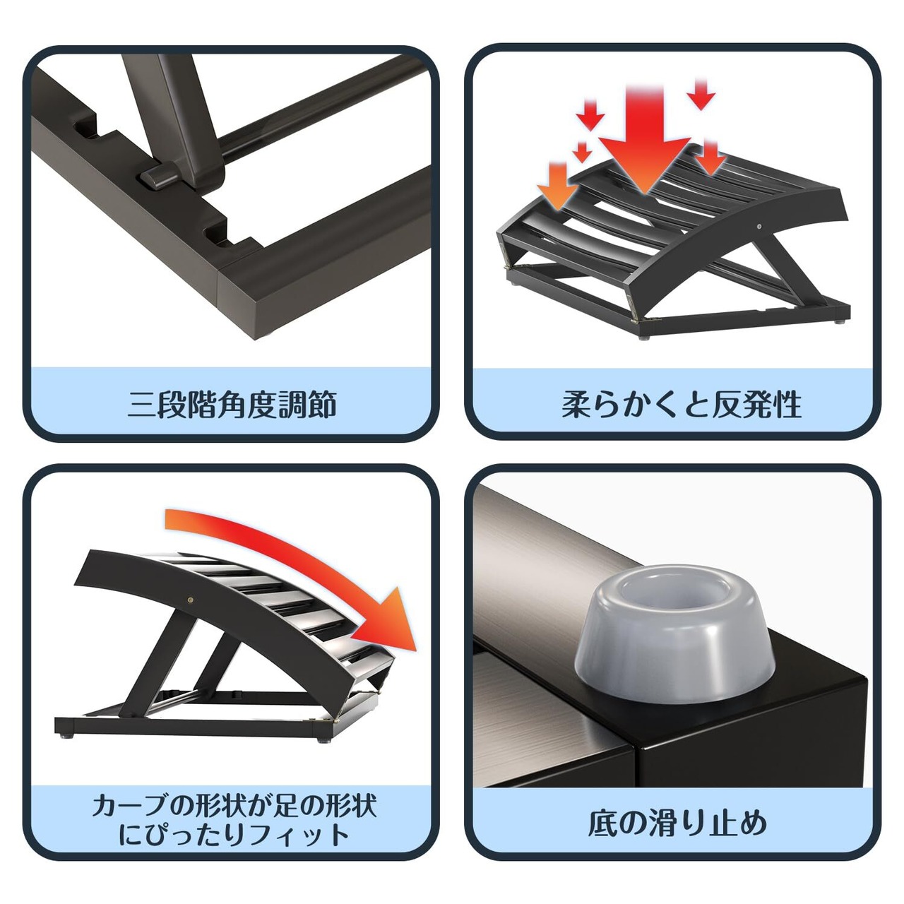 【フットレスト軽減】デスクワーク中に足が地面にしっかりとついていないと、足の疲れや不快感、集中力の欠如につながります。また浮いた足を安定させるため姿勢を悪くしたり、太ももやお尻を圧迫することにより冷え性になることも。フットレストを使用することで、足を時折上げることができ、血液循環を促進する助けとなり、足が快適な位置に保たれることで長時間の作業でも足の疲れを軽減できます。