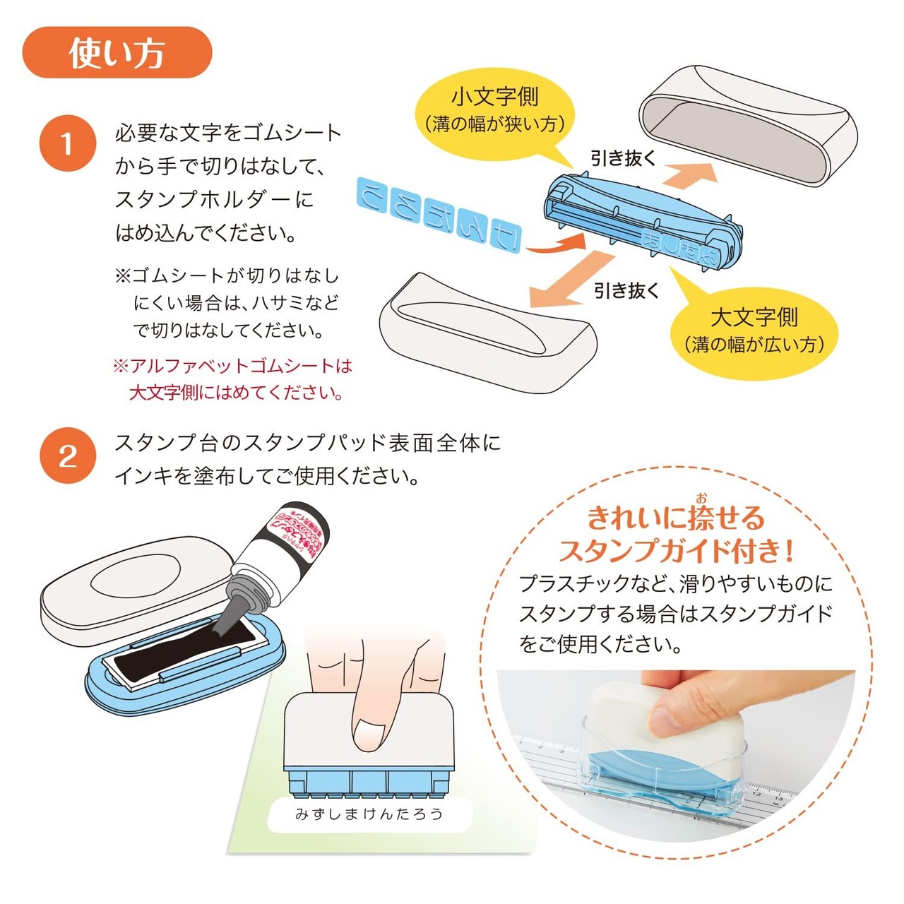 【セット内容】ホルダー、スタンプホルダー、ホルダーキャップ、スタンプガイド、ゴムシート、スタンプ台、インク(黒)