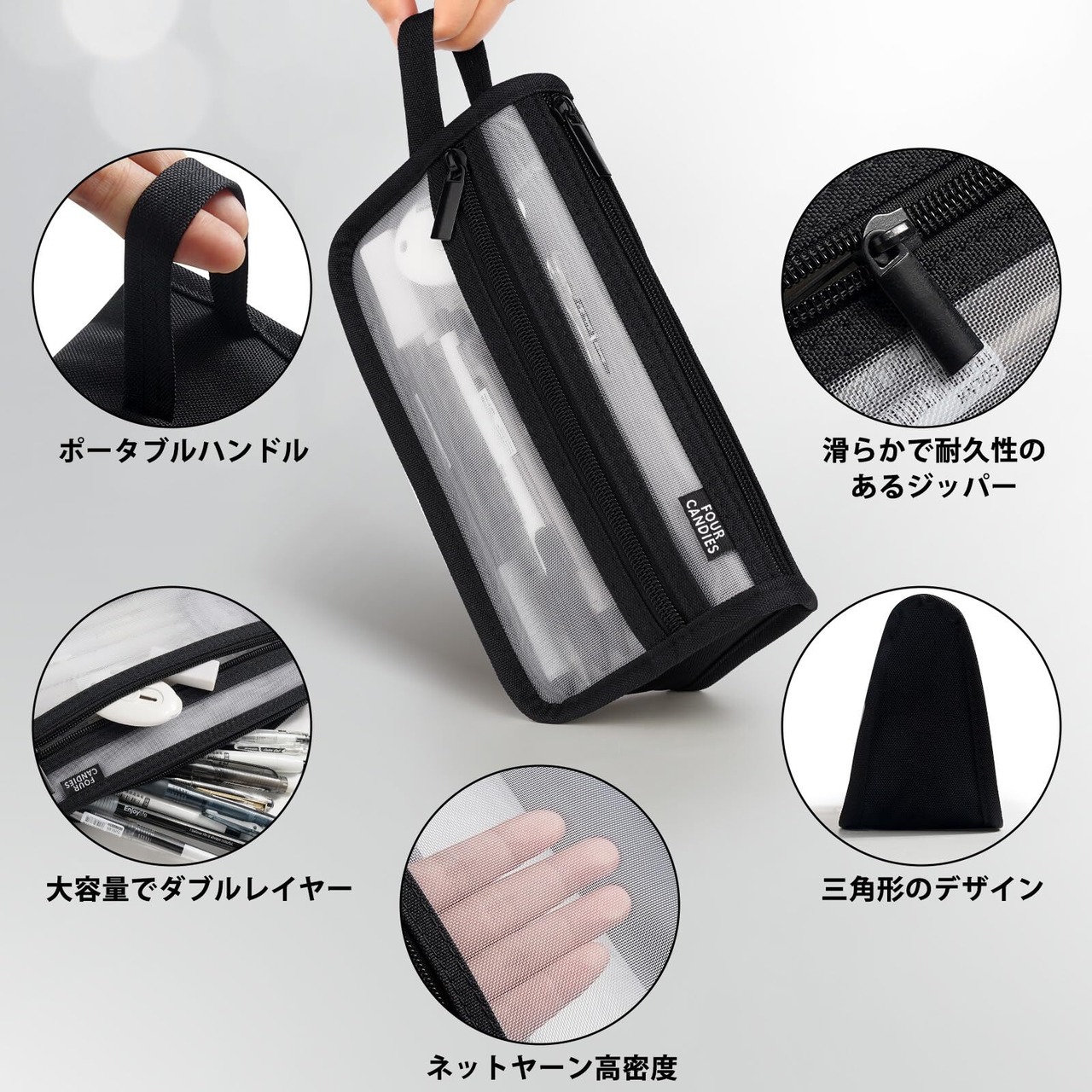 Four Candies ペンケース 筆箱 透明 メッシュポーチ 大容量 ハンドルとジッパー付き クリアダブルレイヤー筆箱 マーカーポーチ 旅行化粧バッグ 女の子 男の子 大人のオフィスや学生のための可愛い透明文房具-ブラック