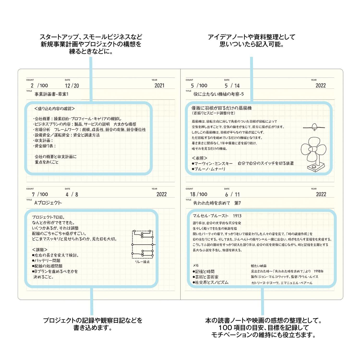 色名:100日間 A5サイズのコンテンツノート。日付けフリーの1日1/2ページの100日間デイリーグリッドメモ10ページパーソナルデータ中紙は仕事計画ダイアリーと同じクリーム紙を使用中紙はFSC森林認証紙
