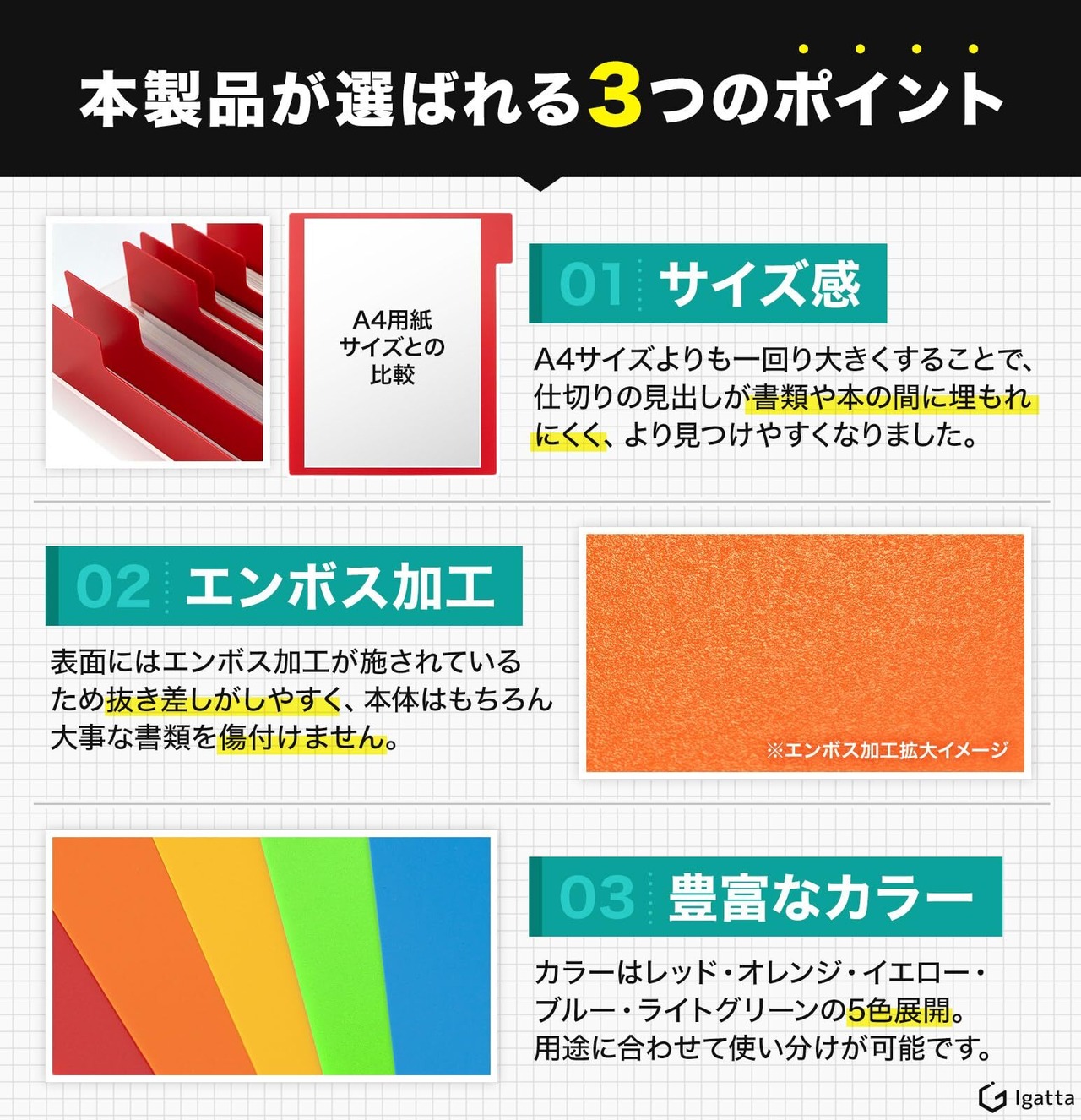 【3つのポイント】《サイズ感》A4サイズよりも一回り大きくすることで、仕切りの見出しが書類や本の間に埋もれにくく、より見つけやすくなりました。《エンボス加工》表面にはエンボス加工が施されているため抜き差しがしやすく、本体はもちろん大事な書類を傷付けません。《豊富なカラー》カラーはレッド・オレンジ・イエロー・ブルー・ライトグリーンの5色展開。用途に合わせて使い分けが可能です。