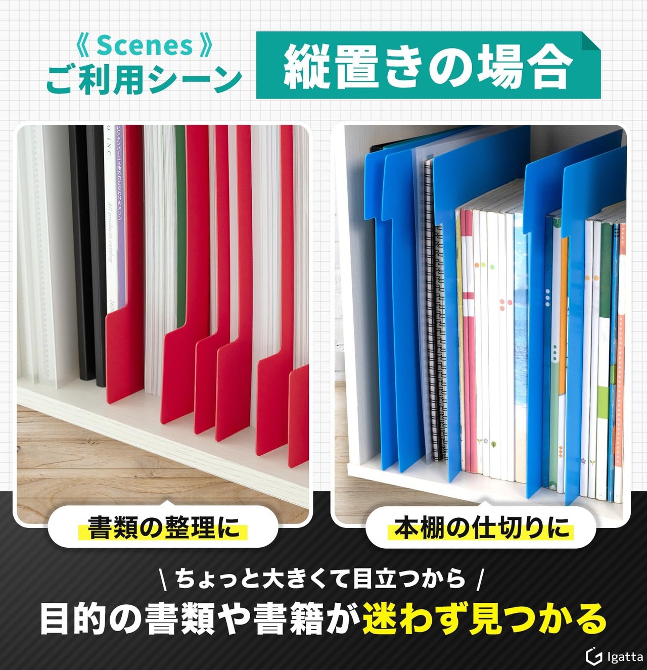 【縦置きで使用した場合】《書類の整理に》整理がしづらくごちゃごちゃになりがちな書類も、わかりやすくすっきりと管理できます。《本棚の仕切りに》教科書や図鑑の収納に利用すればお子様の整理整頓の習慣化にも繋がります。