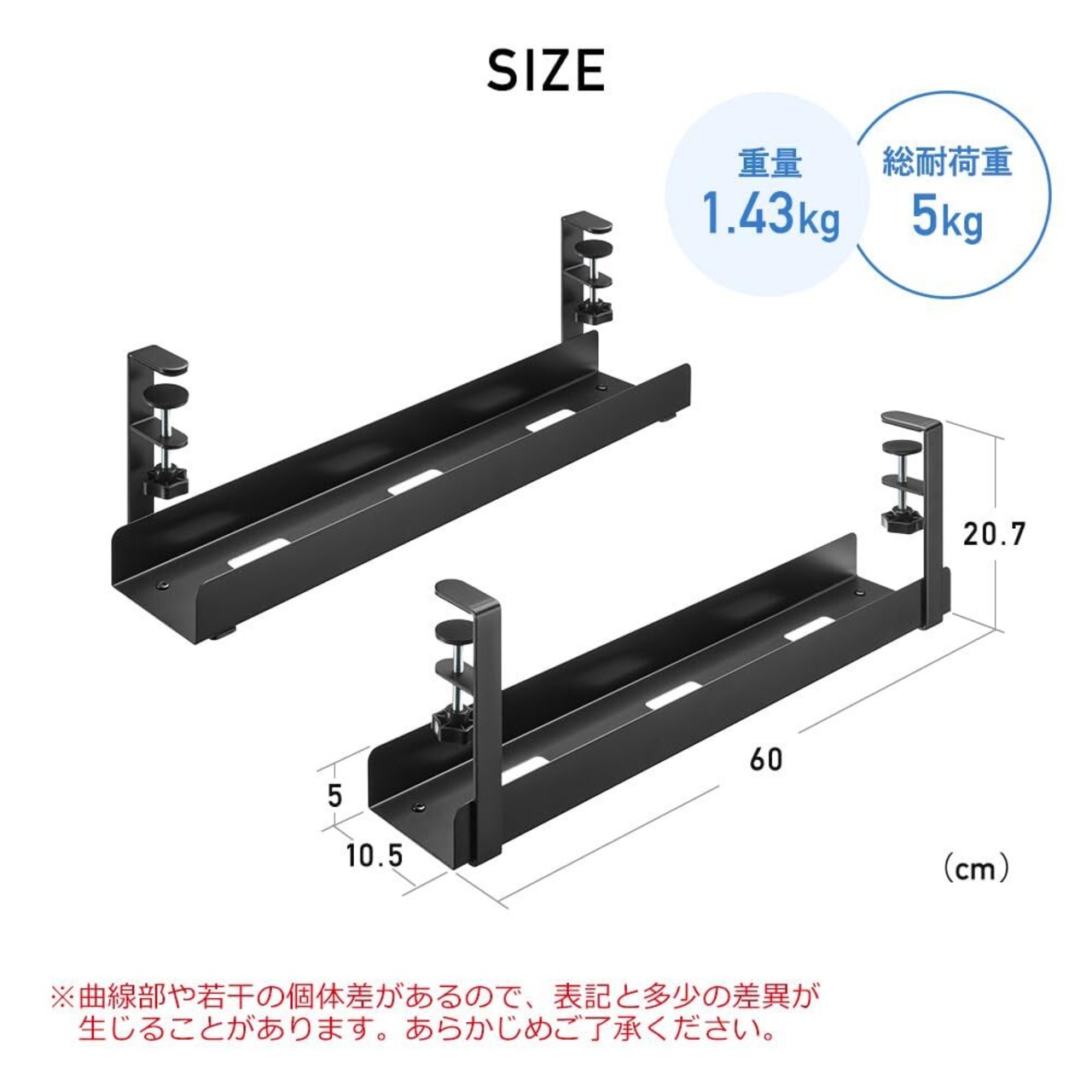 【仕様】カラー:ブラック 製品サイズ:W600×D105×H207mm 製品重量:1.43kg 対応天板サイズ:厚さ5~50mm 出荷形態:ノックダウン組立式(お客様組み立て) 材質:スチール 付属品:クランプ 総耐荷重:5kg 取扱説明書:日本語取扱説明書あり