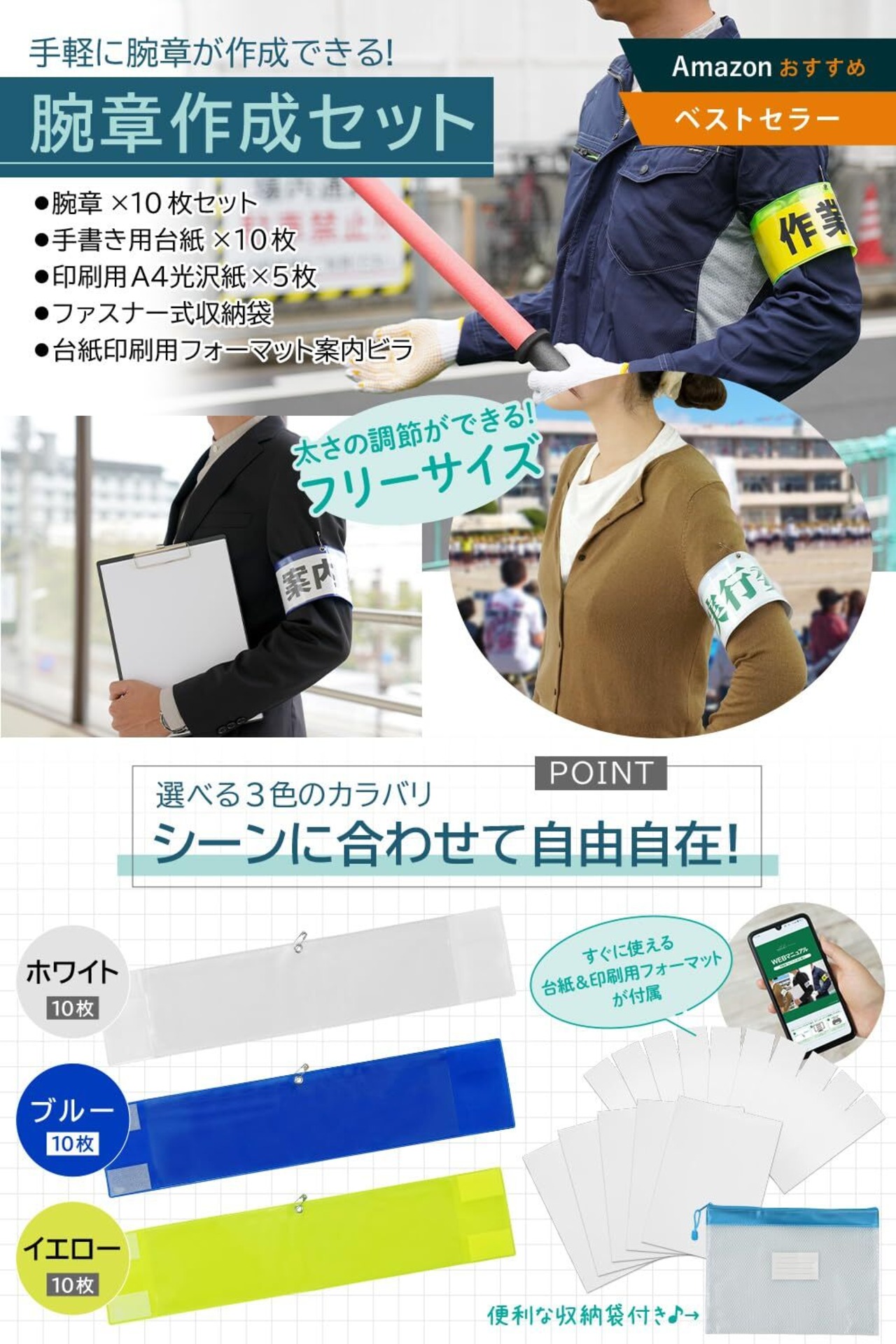 【セミナーや展示会、地域のイベントで大活躍!】皆様に選ばれ続けている腕章セットです!業務用からちょっとした地域イベントまで! 初めての方も簡単に作成できる腕章セットです。 カラーバリエーションは白、青、黄色の3色! 腕章はマジックテープで簡単装着。固定用ピンの固定も可能です! 腕章の台紙は手書き用と印刷用の2つを準備しました。 お好みに合わせて台紙を作成できます。 印刷用台紙の作成フォーマットを準備しました。 ファイル内の背景色や文字を入力して印刷するだけで簡単に台紙を作成できます! 腕章を使わないときの保管や持ち運びを考慮して収納用の保管袋を準備しました。 未使用時の保管方法もこの商品で解決しました!