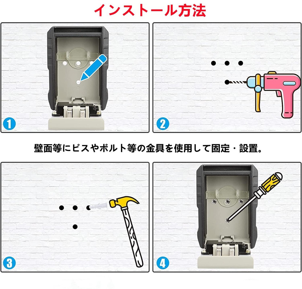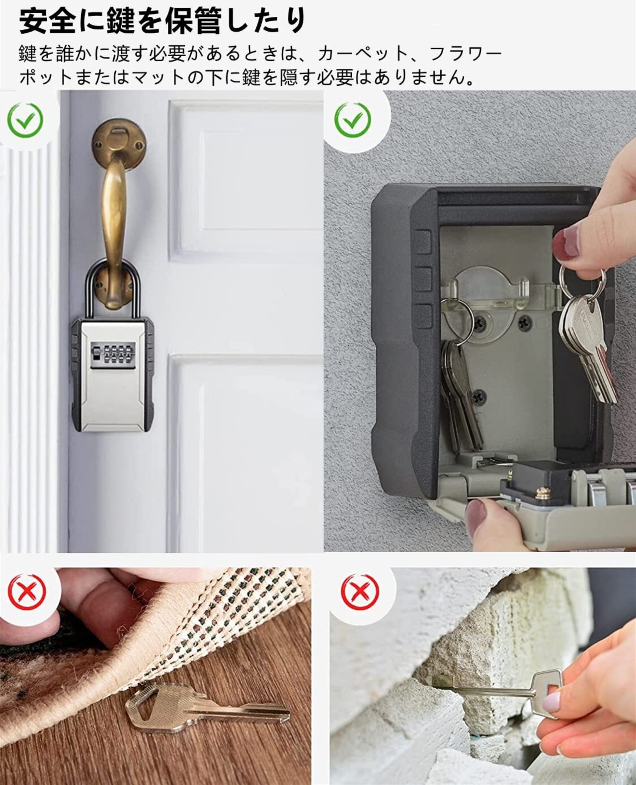 ️【さまざまな用途】この耐候性キーボックスはさまざまな場所で使用できるため、カーペットや植木鉢の下に鍵を隠す必要はありません。非常口、別荘、ペットシッター、その他必要な場所など、屋内と屋外に最適です。取り付けの必要がなく、自宅のドア周辺などにキーボックスを設置し、スペアキーを入れておけば、万が一の鍵の紛失時に役立ちます。また、「なくすかもしれないから、子どもには鍵を持たせたくない」という場合にも!うまく活用して、大切な鍵を安全に管理しましょう!