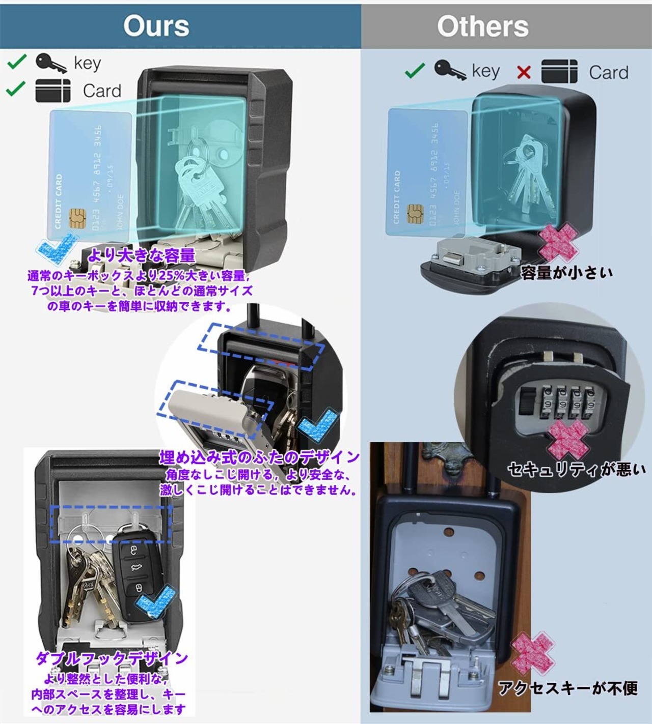 ️【埋め込み式のふたのデザイン】防水・防湿;カバーの隙間から雨水が内部に入りにくい。角度なしこじ開ける;より安全な、激しくこじ開けることはできません。【ダブルフックデザイン】より整然とした便利な;内部スペースを整理し、キーへのアクセスを容易にします。