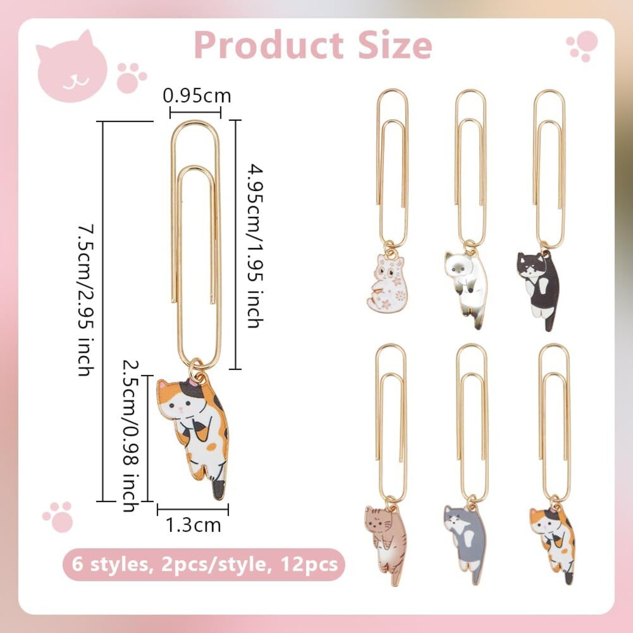 パッケージとサイズ: パッケージには12個の猫ペンダントクリップが含まれています。サイズ:長さ約75mm、クリップ:49.5x9.5x1mm、ペンダント:25x13x1~2mm。