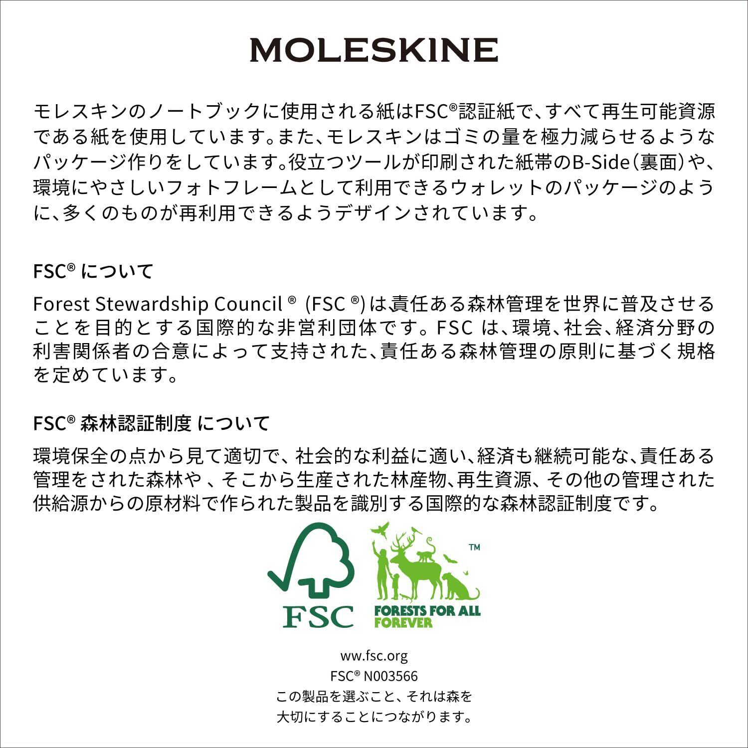 【紙質】FSC認証 70 g/m²中性紙 /モレスキン製品に使用される独特のアイボリーカラーの紙は、すべての言葉、すべてのスケッチを際立たせる暖かみのあるキャンバスを提供するために繊細に調整されています。なめらかな手触りのこの紙は、その感触 とボディを意図的にバランスさせ、ページをめくるときに、格別にクリアで、しかしなめらかな落ち着いた音がします。