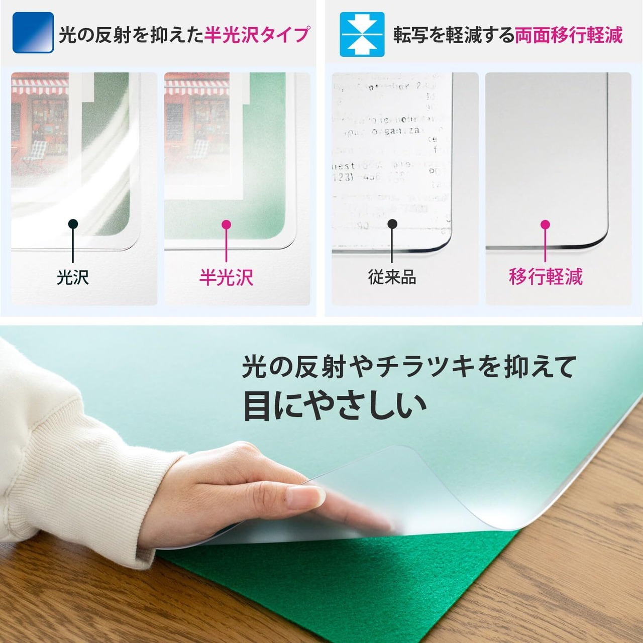 光の反射が少なく、挟んだものが見えやすいノングレア(シボ)タイプです。