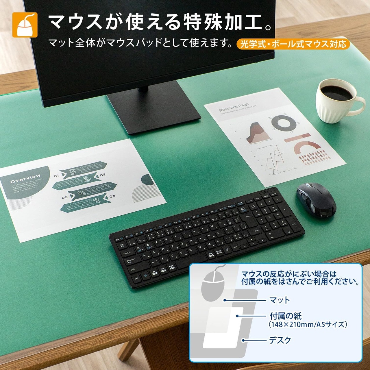 マウスが使える特殊加工で、マット全体がマウスパッドとして使えます。(光学式/ボール式マウス対応※)