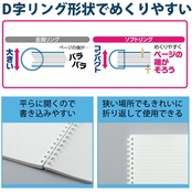リングの形状が「D字型」になっているので、ぺージがめくりやすく、ノートのページの端がそろいやすくなっています。
