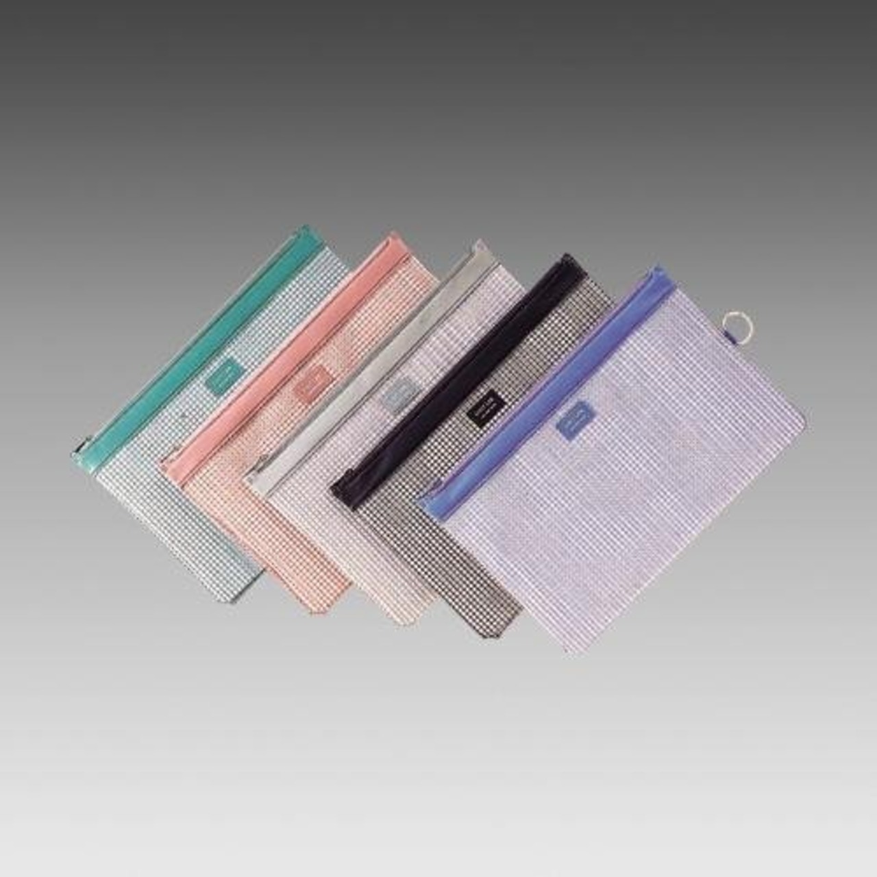 ●メッシュの入った透明素材で、中身が一目瞭然。●メッシュカラーはおしゃれな「PLAN-DO-SEE」のアーバンカラーで、オフィスでもホームユースでも対応します。●吊下げに便利なリングフックがついているので、壁に吊下げたり、キーホルダーをつけたり、様々に使用できます。●マチのない薄型クリヤーケースです。●マチなし●ジッパータイプ●リングフック付