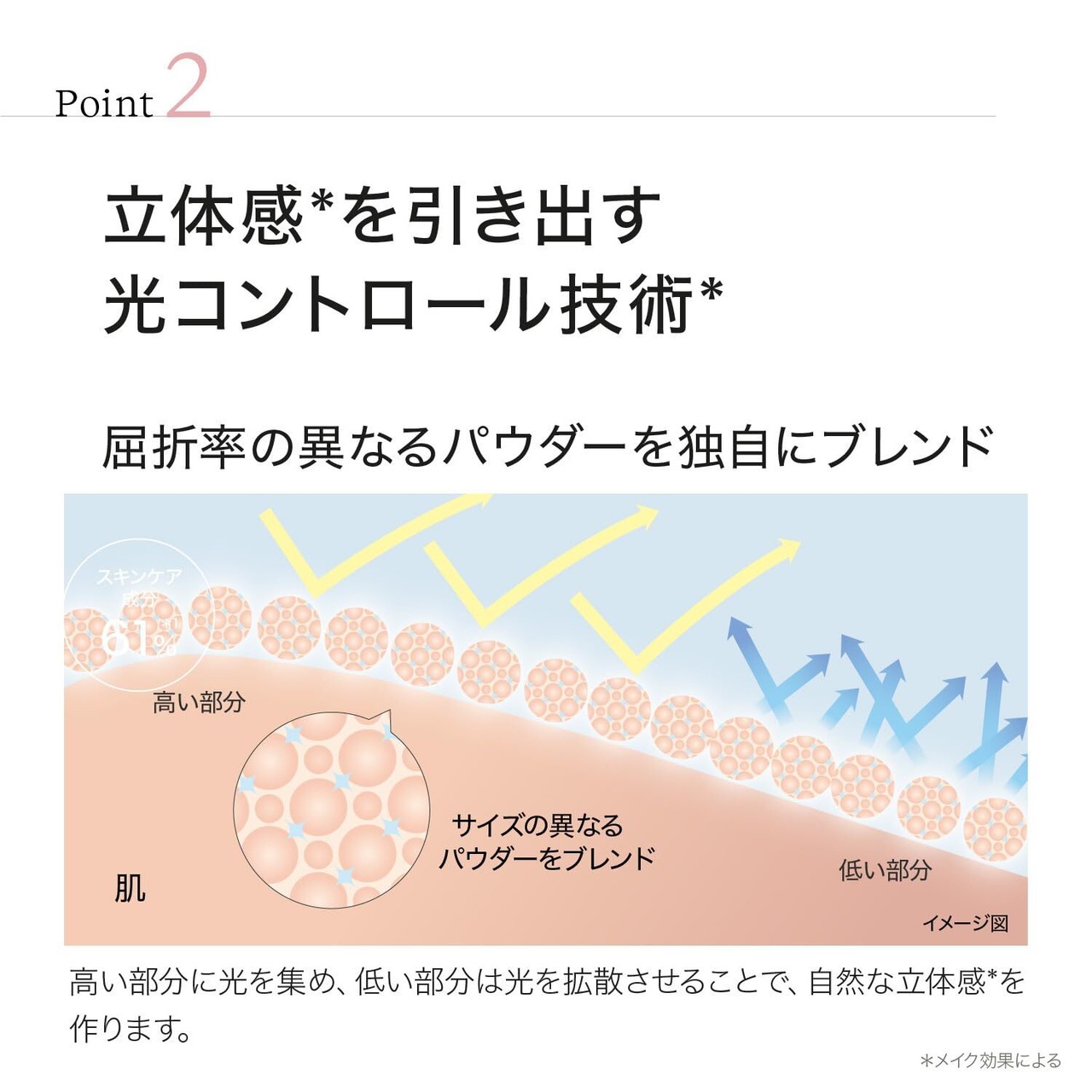 立体感を引き出す光コントロール技術 屈折率の異なるパウダーを独自にブレンド。高い部分に光を集め、低い部分は光を拡散させることで、自然な立体感を作ります。また、うるおいヴェールがパウダーを肌にぴたりと密着させ、光コントロール効果を持続。 ※立体感:メイク効果による