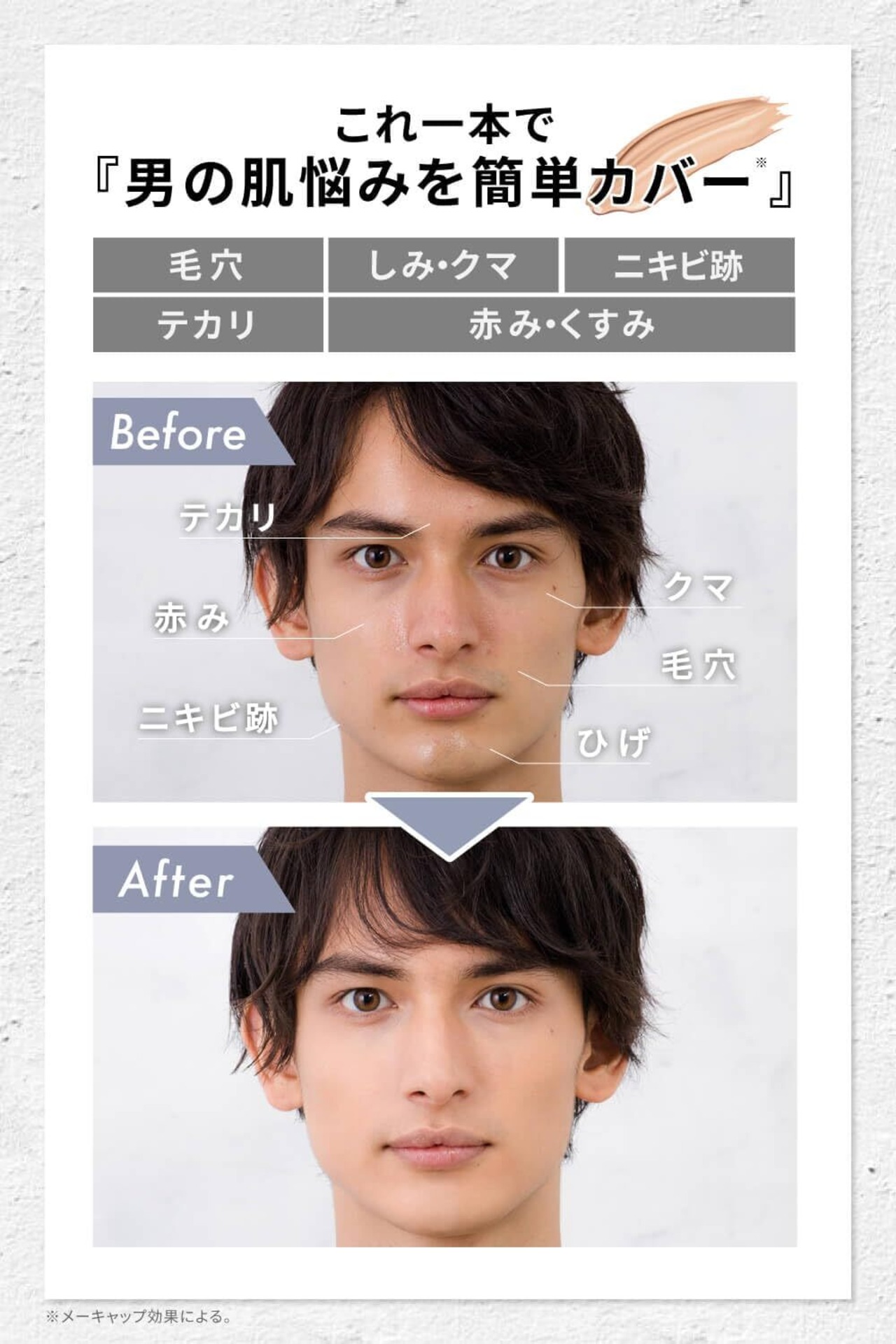 【肌の悩みを自然にカバー*】 ソフトフォーカス 効果のあるパウダー配合。 ナチュラル な艶感なのに、さっぱりとしたつけ心地を実現しました。 軽いつけ心地で、男性の肌悩みに多い【 肌の赤み くすみ 毛穴 シミ ニキビ跡 テカリ】を自然にカバー*することができます。 *メーキャップ効果による。