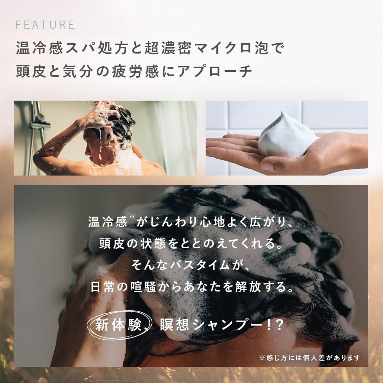 ・じんわりとしたぬくもりが広がりスッキリ軽やかに洗いあがることで地肌がほぐれ頭が軽くなったような快感が得られる