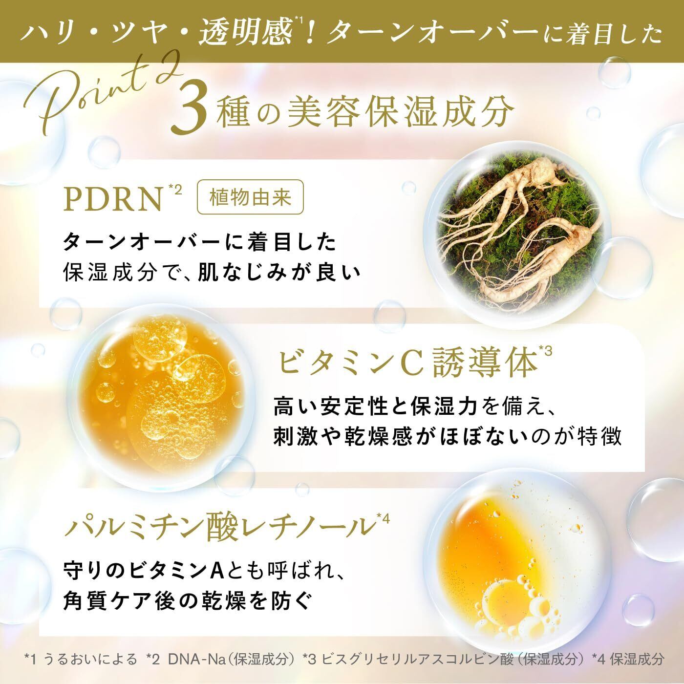 【ターンオーバーに着目】植物性PDRNを筆頭に、ビタミンC誘導体、パルチミン酸レチノールを配合。3種の美容保湿成分が刺激を抑えつつ角質ケア後の乾燥を防ぎます。