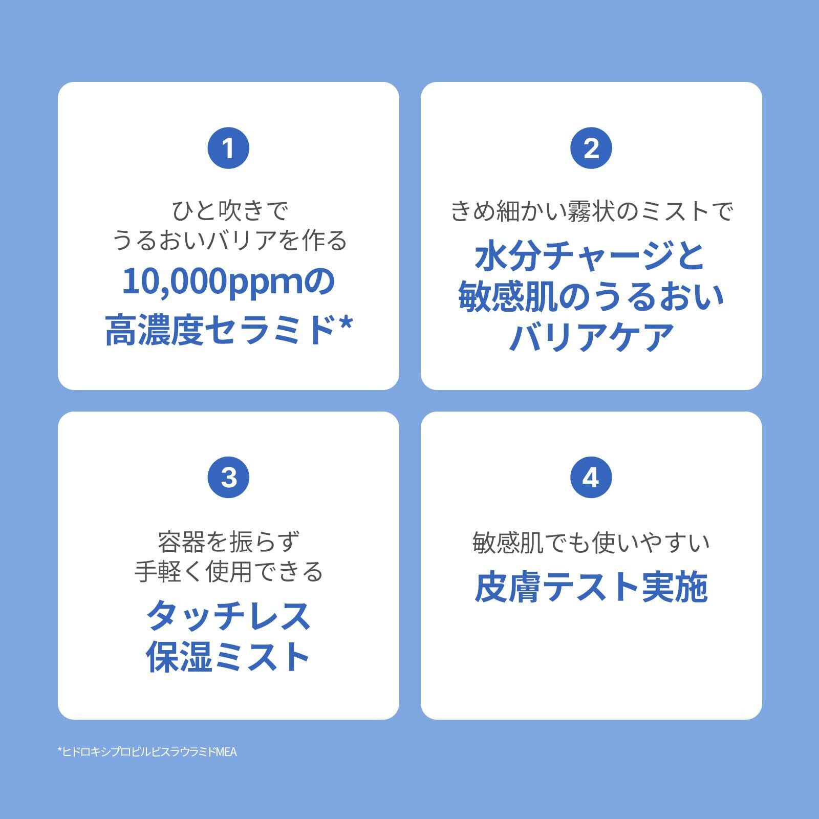 【10,000ppmの高濃度セラミド*】セラミド*が10,000ppm配合され、ひと吹きするだけで長時間しっとりが続く保湿ミストです。 *ヒドロキシプロピルビスラウラミドMEA
