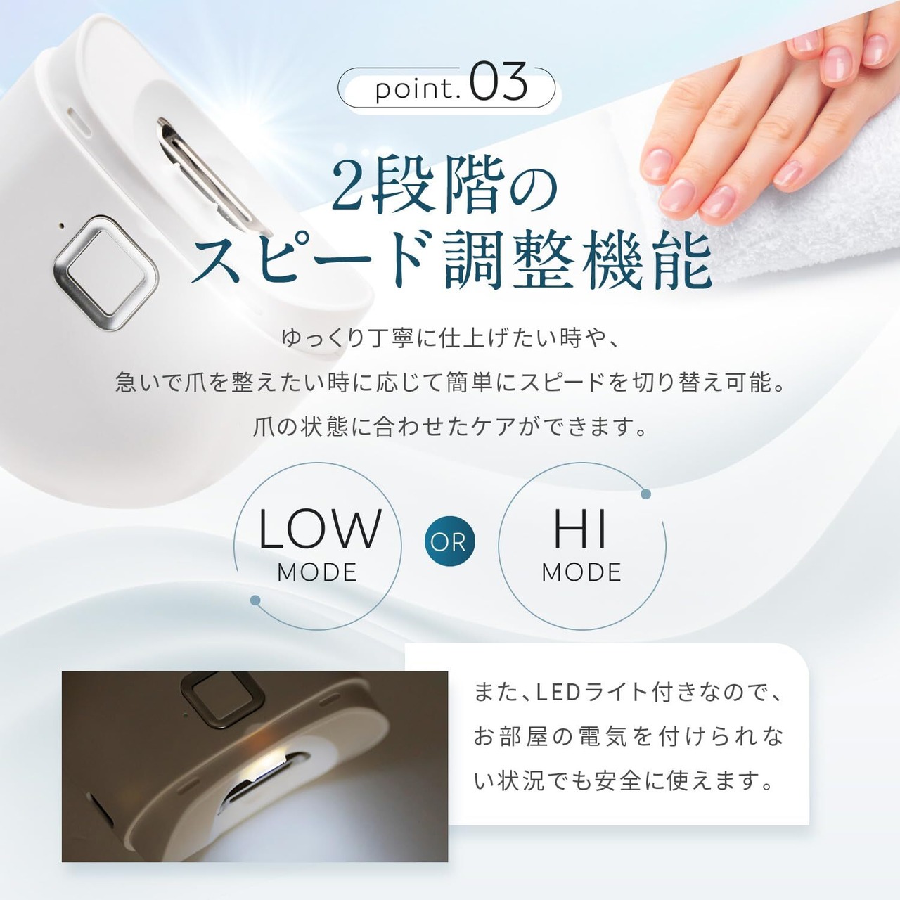 【静かな稼働音】静音設計のため、お子さまが寝た後のリラックスタイムにもお使いいただけます。爪切りのパチッという音でお子さまが起きる心配もなく、好きな時間にお使いいただけます。また、音が静かなためお子さまの爪のケアにもお使いいただけます。※小学生のお子様には必ず保護者様がご使用ください。また、赤ちゃんにはご使用をおやめください。(赤ちゃんには「LeLanteベビー用電動爪やすり」がおすすめです)
