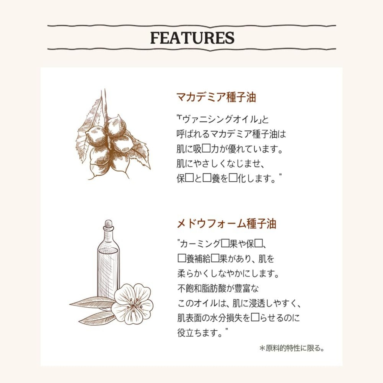 全成分:スクロース (36.5 %),グリセリン,PEG-7グリセリルココエート,マカデミア種子油,キャンデリラロウ,トリ(カプリル/カプリン酸)グリセリル,エチルヘキサン酸セチル,ラノリン,ステアラルコニウムヘクトライト,メチルベンゼトニウムクロリド,シア脂,水,ラウリン酸ソルビタン,カラメル,1,2-ヘキサンジオール,エチルヘキシルグリセリン,BG,月見草油,オリーブ果実油,ユチャ種子油,ホホバ種子油,コメ発酵液,プロパンジオール,レモン果実エキス,リンゴ果実エキス,オレンジエキス,パパイア果実エキス,レピジウムメイエニ根エキス,コウタケエキス,カプリリルグリコール,香料,リモネン,シトラール