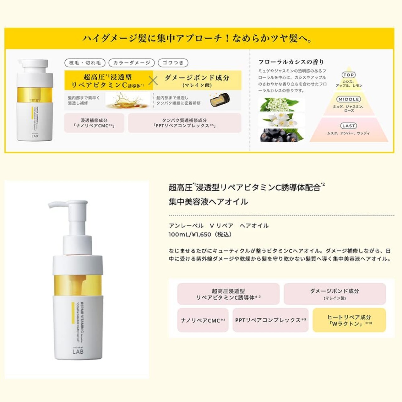 アンレーベル unlabel ラボ V リペア ヘアオイル 100mL 日本製 ヘアケア ビタミンC誘導体 美容液 保湿 集中ケア ダメージ補修 ツヤ髪 キューティクル保護