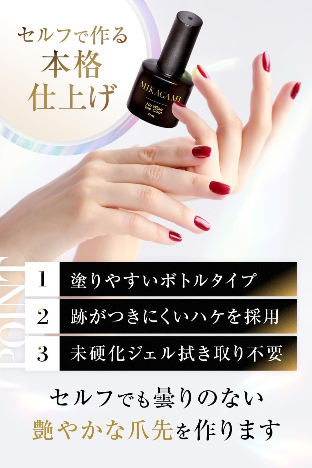【ノンワイプトップジェルの特徴】あふれる透明感が光沢を引き立て、爪先を美しく見せます。HEMAを含まないので、HEMAアレルギーの方にもご使用頂けます