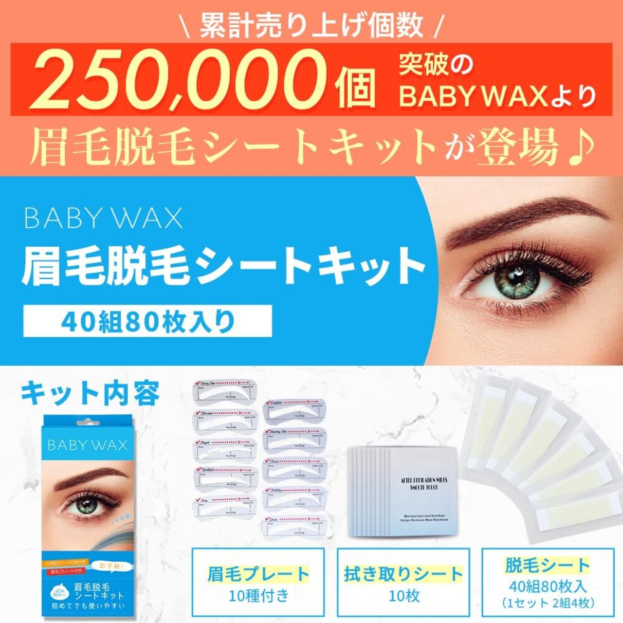 【自宅で簡単!理想の眉へ】累計売上個数25万個突破!BABY WAX 眉毛脱毛シートキット。【内容量】眉毛プレート10種・拭き取りシート10枚・脱毛シート40組80枚入り