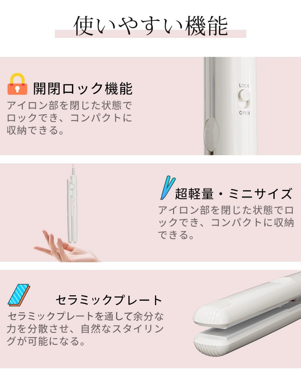 ヘアアイロン ミニ 超軽量 ストレートアイロン 前髪用 カール ストレート 高温220℃ 急速加熱 マイナスイオン搭載 ツヤ髪 ヘアケア コテ 18mm コンパクト 持ち運び便利 ヘアスタイリング ワンタッチロック付き 海外対応 レディース メンズ 誕生日 プレゼント (ホワイト)