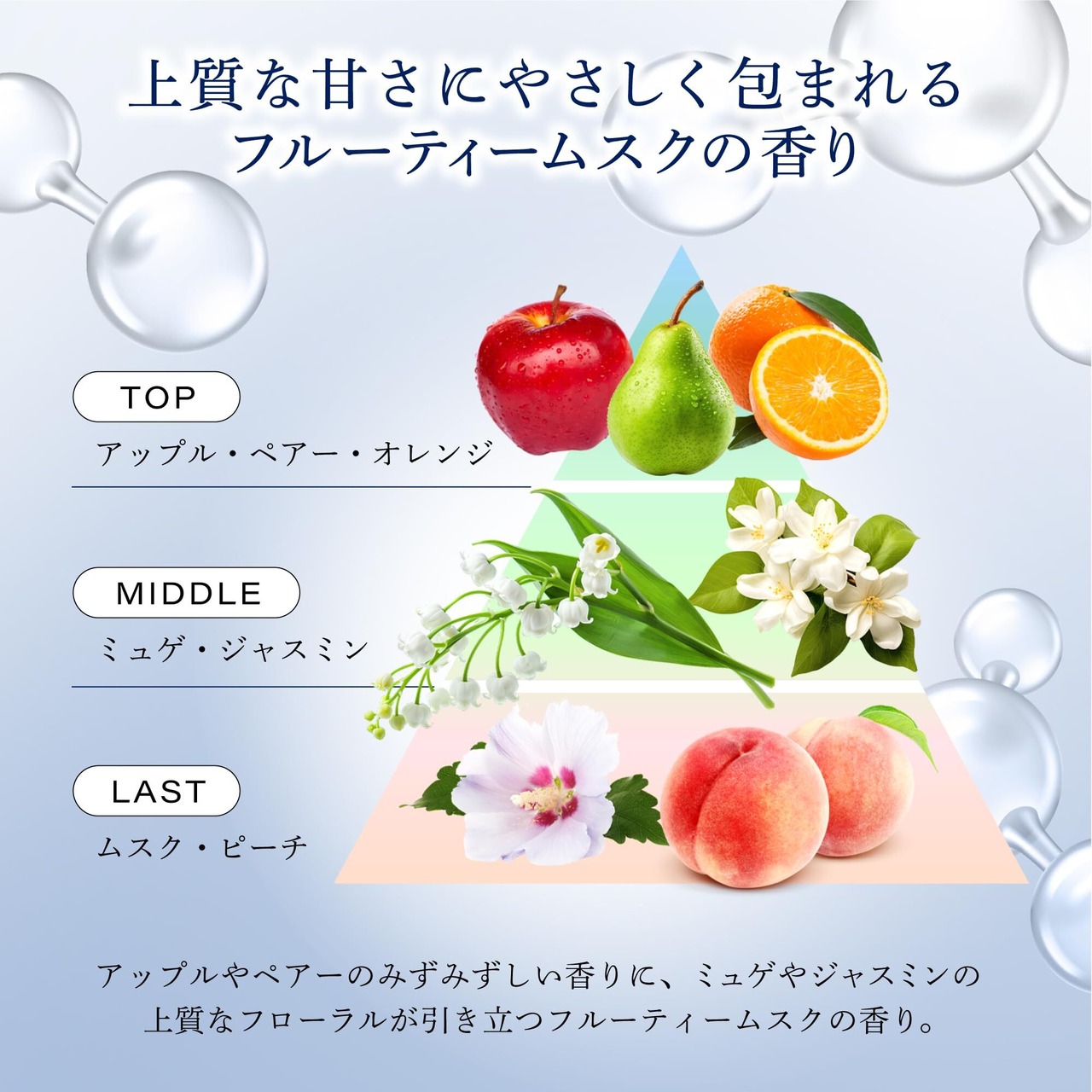上質な甘さにやさしく包まれるフルーティームスクの香り。 ※1超高圧加工処理装置を用いた原料※2超高圧処理したイソステアロイル加水分解コラーゲン(保湿)を配合。