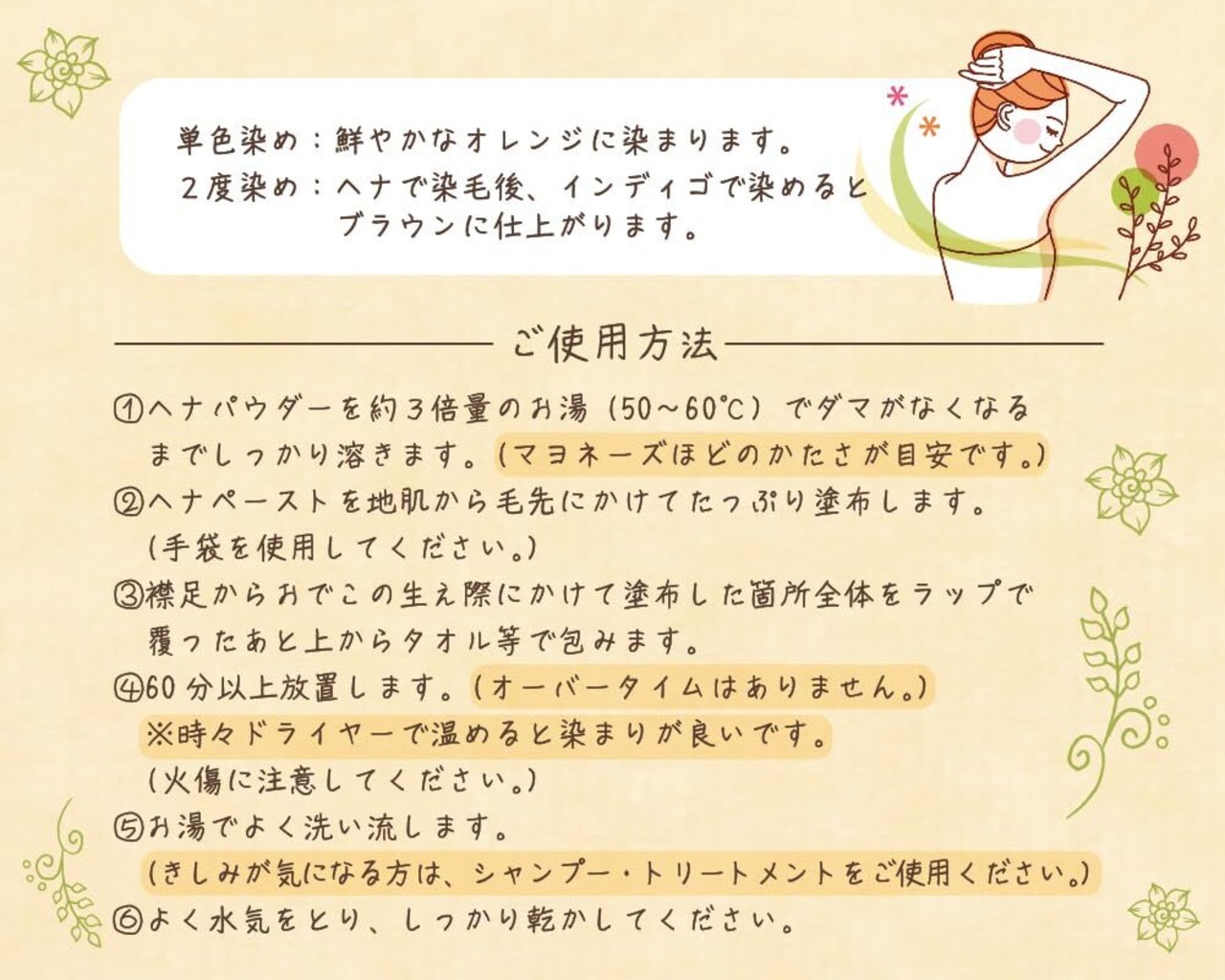 ●Aランクオーガニックヘナの天然植物染料です。40~60分程度の時間でヘナ特有の綺麗なオレンジ色に発色します