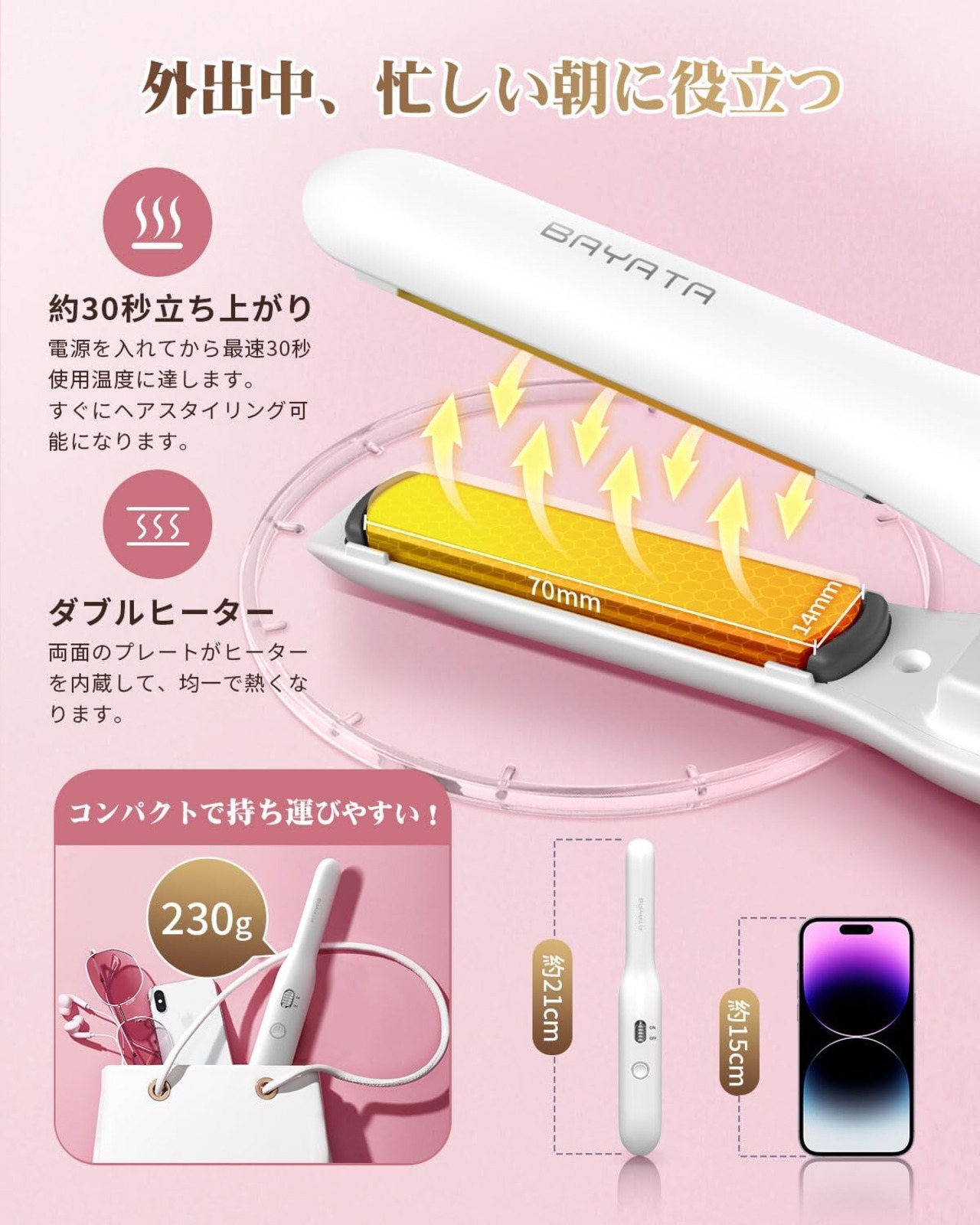 BAYATA ヘアアイロン コードレス【電池着脱式・機内持ち込み可 】充電式アイロン 160℃~200℃三段階温度調節 バッテリー取り外し可能 ミニ 持ち運び 携帯 前髪 ヘアストレートナー ストレート コンパクト usb 海外対応 全髪質対応 ワイヤレス メンズ 男女兼用 外出用/職場/旅行