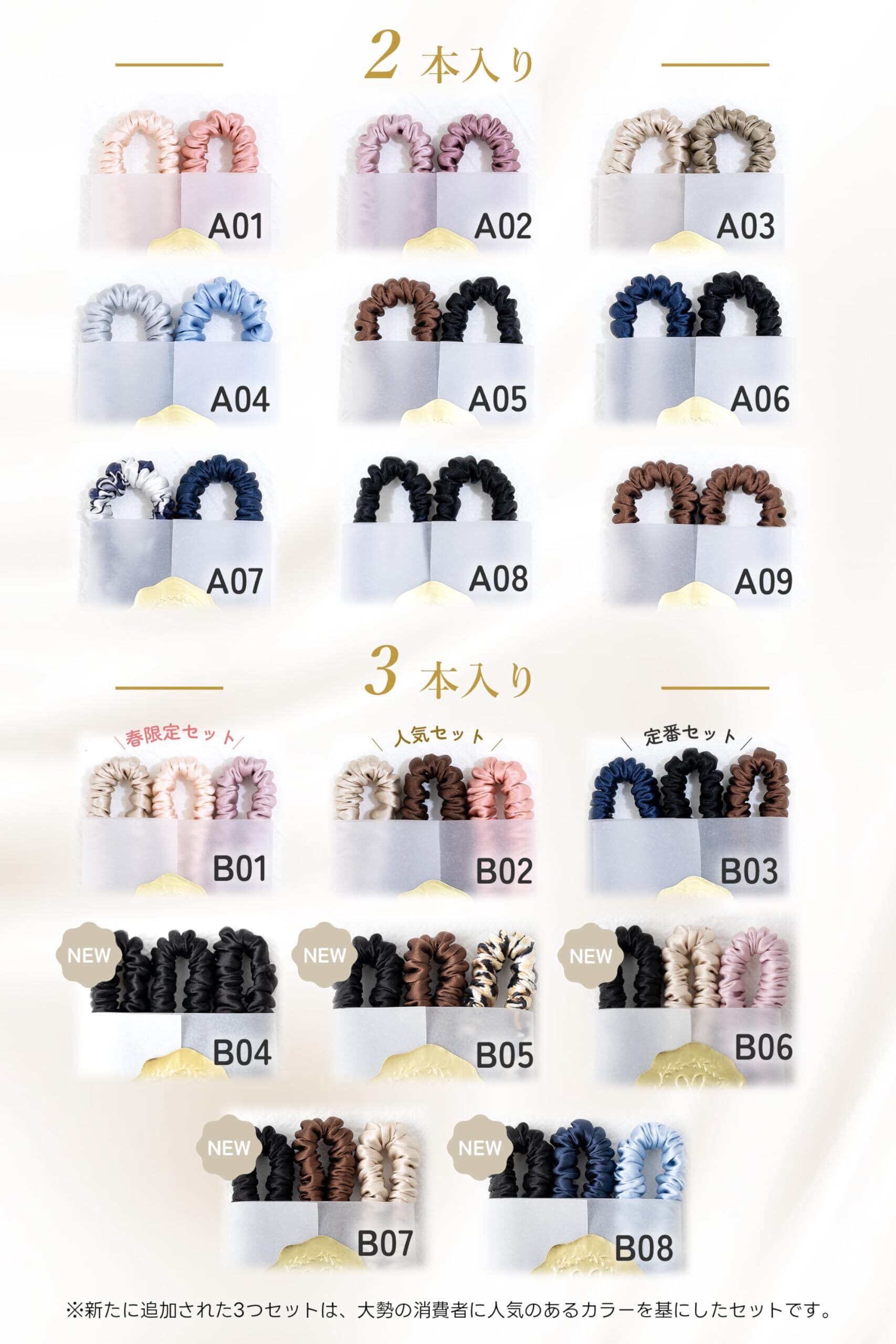 【カラー展開・選べるセット】豊富なカラー展開には、ブラック、ブラウン、ネイビー、ピンクベージュ、ローズベージュ、アッシュピンク、アッシュローズ、カーキベージュ、カーキ、シルクグレー、スモークブルー、ネイビーフローラル、レオパードが含まれています。2本セットと3本セットのオプションがあり、日々のスタイリングを華やかに彩ります