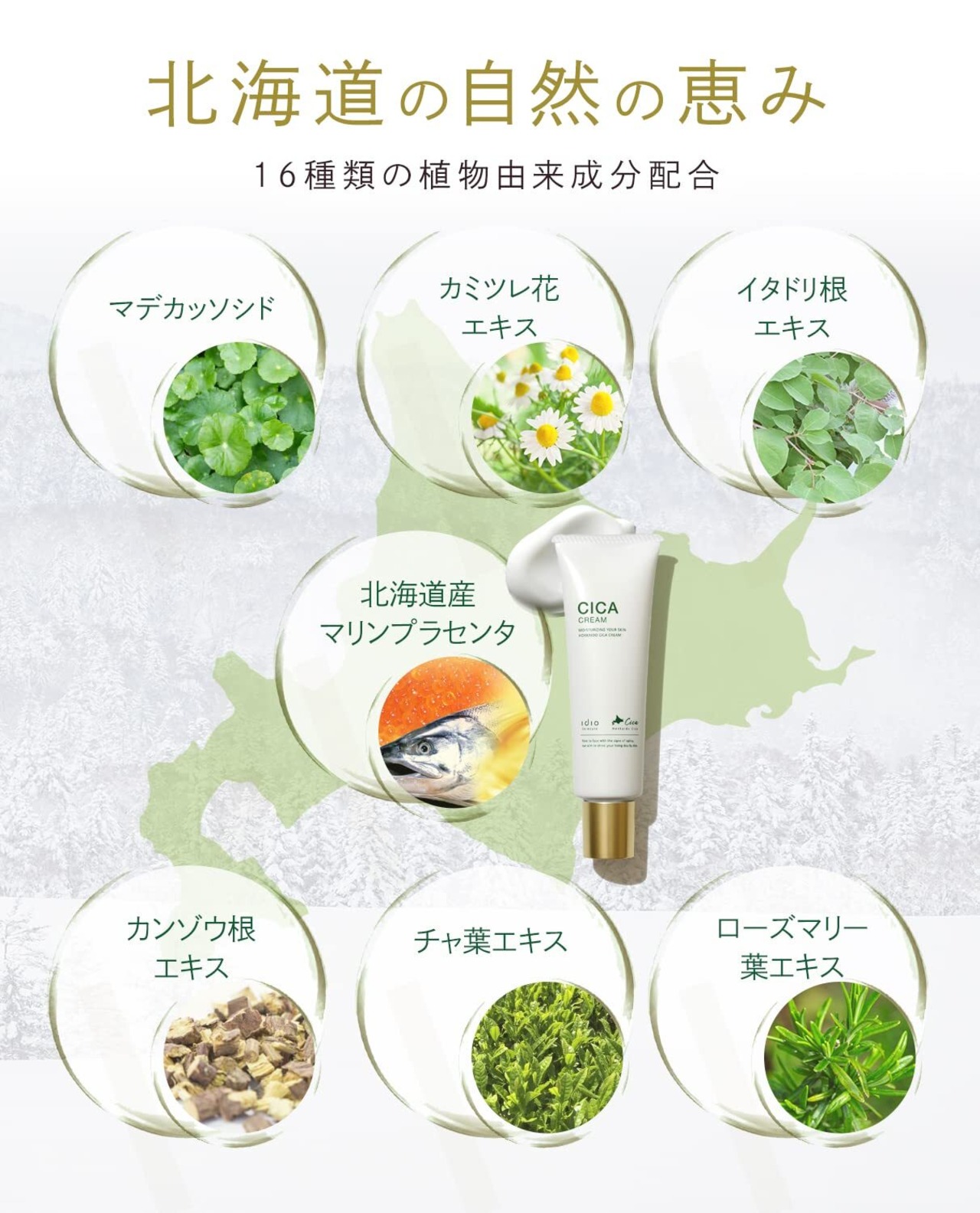 【北海道由来の自然成分】ツボクサエキスを始め16種類の植物由来成分、さらに北海道産の鮭卵巣膜から抽出したプラセンタなど高品質な保湿成分を配合。