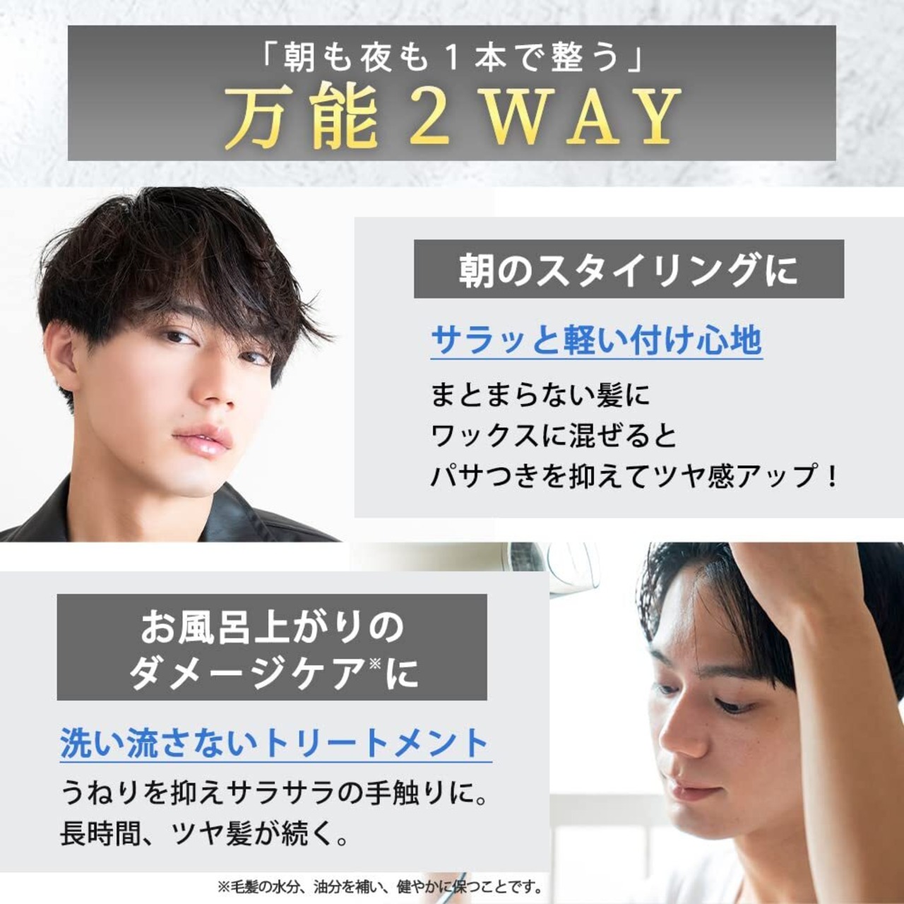 【朝も夜も1本で】朝のスタイリング時にワックスに混ぜてツヤ感UP!夜には洗い流さないトリートメントとしても。