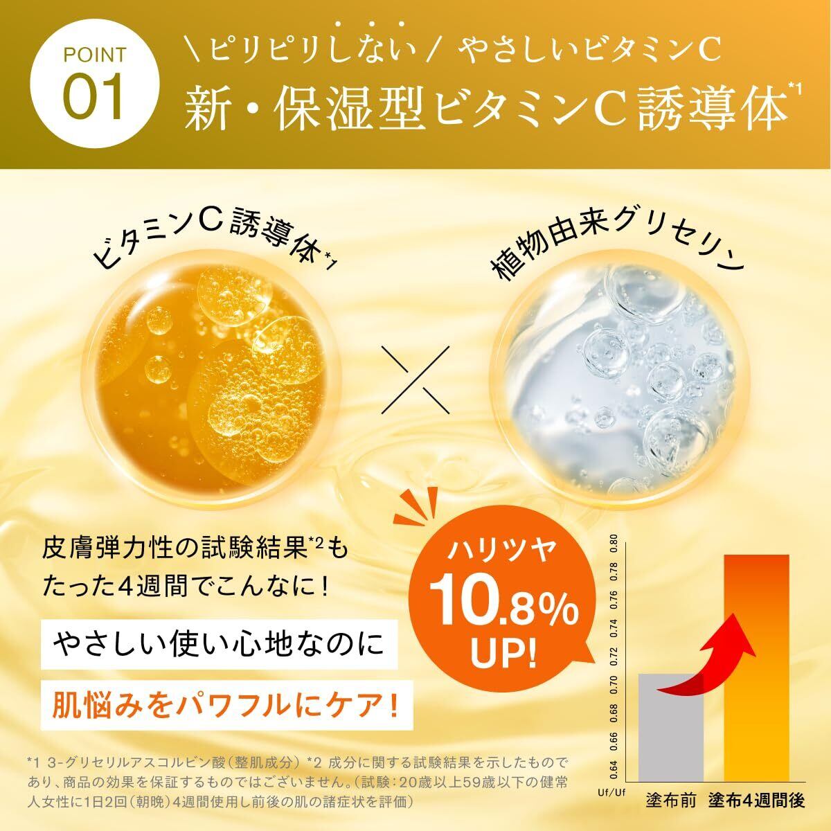【低刺激設計の高濃度ビタミンC】化粧水の前に使用する導入美容液です。すーっと伸びがいいので、1回量はたった3滴でOK。朝晩の2回使用で、ワントーンあかるい肌へ。8つのフリー処方で低刺激設計。